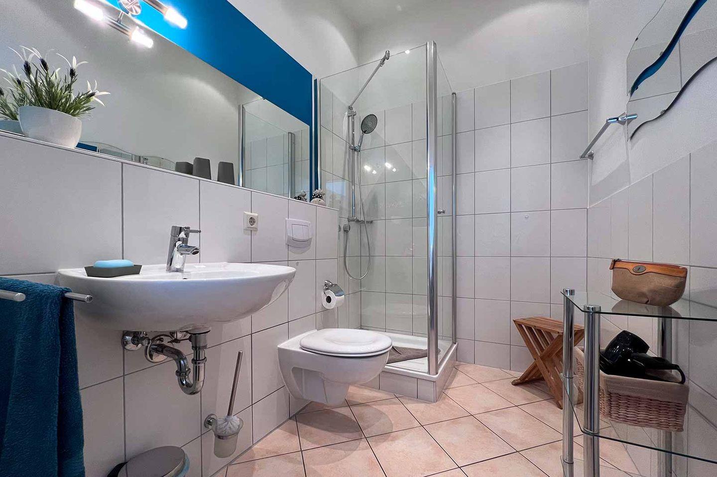 Für zusätzlichen Komfort sorgt das Badezimmer, ausgestattet mit einer Dusche, sowie ein separates Gäste-WC. Zu den praktischen Annehmlichkeiten gehören ein Haartrockner im Badezimmer und eine Waschküche mit Waschmaschine, Trockner und Bügelbrett, die gemeinschaftlich genutzt werden.