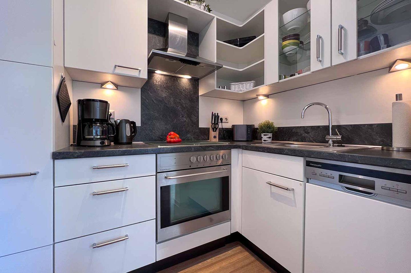 Die offene Küche verbindet sich harmonisch mit dem Essbereich und ist mit modernen Geräten ausgestattet, darunter ein Ceran-Herd, ein Kühlschrank mit Gefrierfach, eine Spülmaschine, eine Mikrowelle und sogar eine Espressomaschine für Ihren täglichen Kaffeegenuss. Kleine Extras wie ein Wasserkocher, Toaster und Eierkocher runden die Küchenausstattung ab. Genießen Sie Ihre Mahlzeiten entweder im Esszimmer oder auf dem Balkon, der Ihnen einen wunderbaren Ort bietet, um die angenehmen Luft der Küste zu genießen.