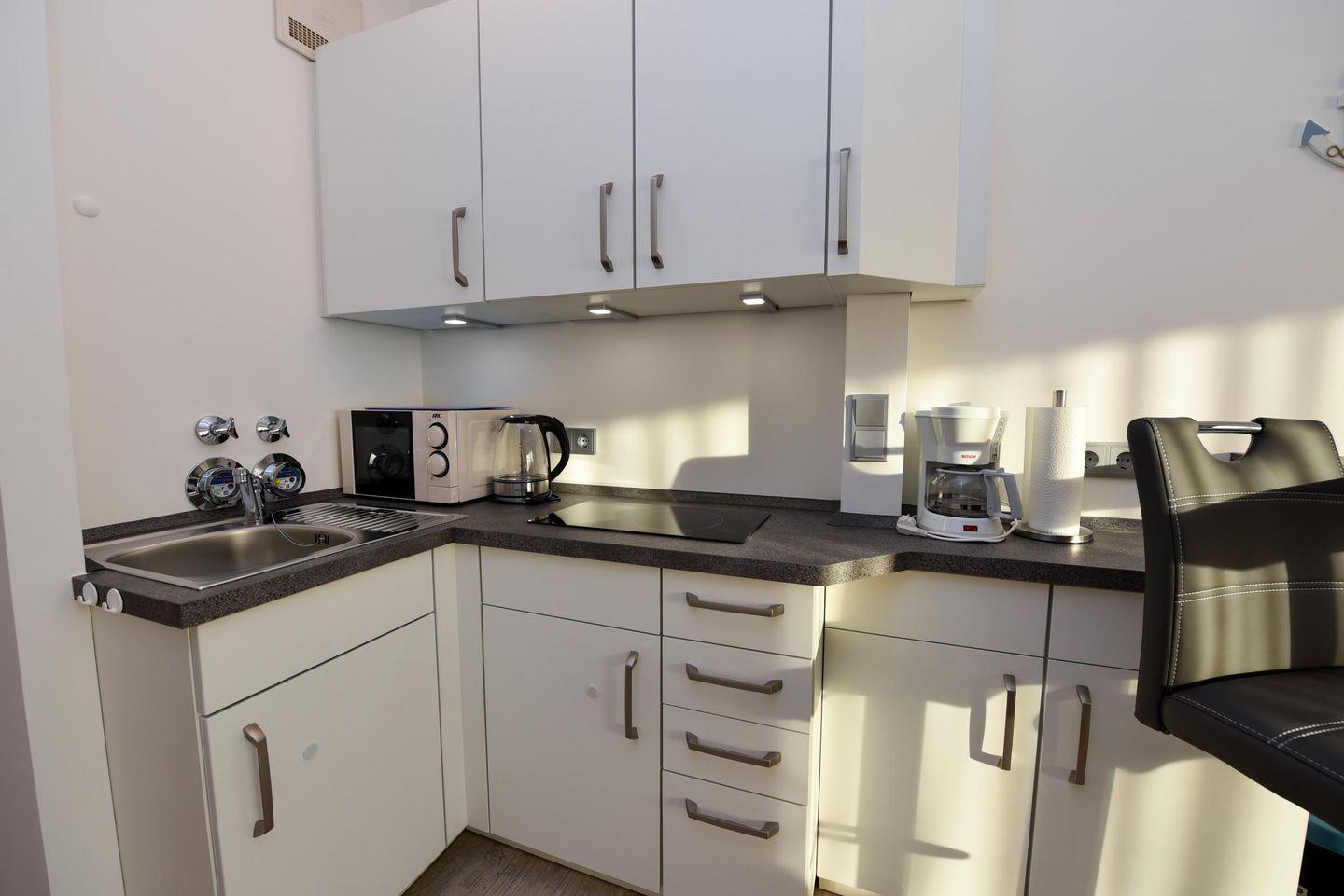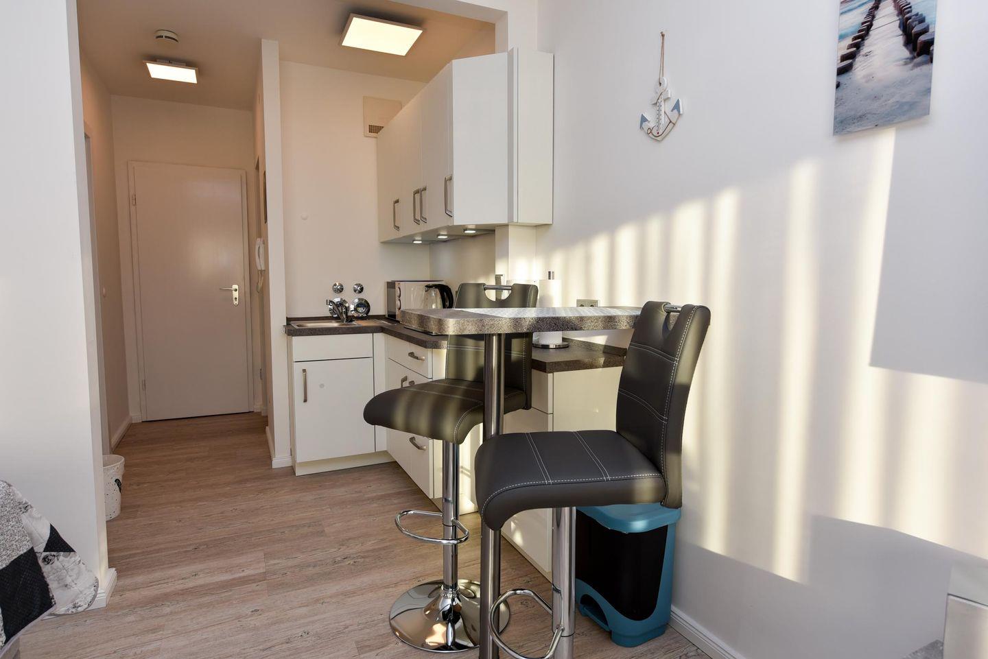 Renoviertes Sonnenappartement für 2 Personen. Das Appartement wurde 2022 komplett renoviert und von Grund auf neu eingerichtet. Im Schlaf- / Wohnbereich befindet sich ein komfortables Boxspringbett. Die kleine aber feine Pantryküche verfügt u.a. auch über eine Mikrowelle. 2 gemütliche Sessel laden zum Verweilen ein. Von hier aus können Sie ihre Blicke entweder in den Garten schweifen lassen, einen gemütlichen Fernsehabend verbringen oder ihre Urlaubslektüre geniessen.