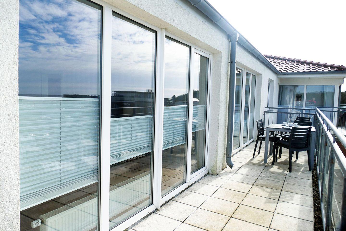 Highlight: die große Süd-West-Dachterrasse mit Meerblick – ideal zum Frühstücken, Sonnenbaden oder für entspannte Abende bei Sonnenuntergang.