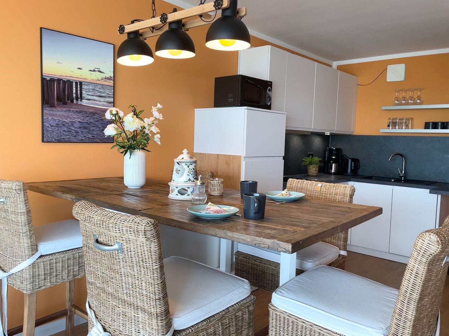 Der durchdachte Grundriss der Unterkunft umfasst ein Schlafzimmer, ein Wohnzimmer mit einer Sofaecke und einem Essbereich sowie eine offene, voll ausgestattete Küche. Die moderne Küche ist mit hochwertigen Geräten ausgestattet, darunter ein Induktionsherd, Backofen, Spülmaschine und Kühlschrank mit Gefrierfach. Ideal für Selbstversorger, steht Ihnen alles Nötige zur Verfügung, um sich kulinarisch verwöhnen zu können. Zu den Annehmlichkeiten gehören auch eine Mikrowelle, ein Wasserkocher, eine Kaffeemaschine sowie Geschirr und Besteck.