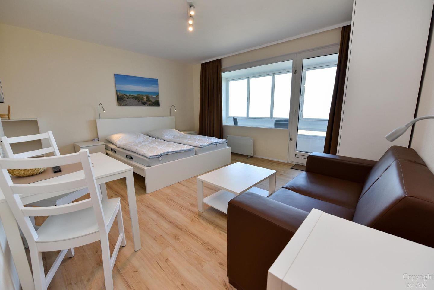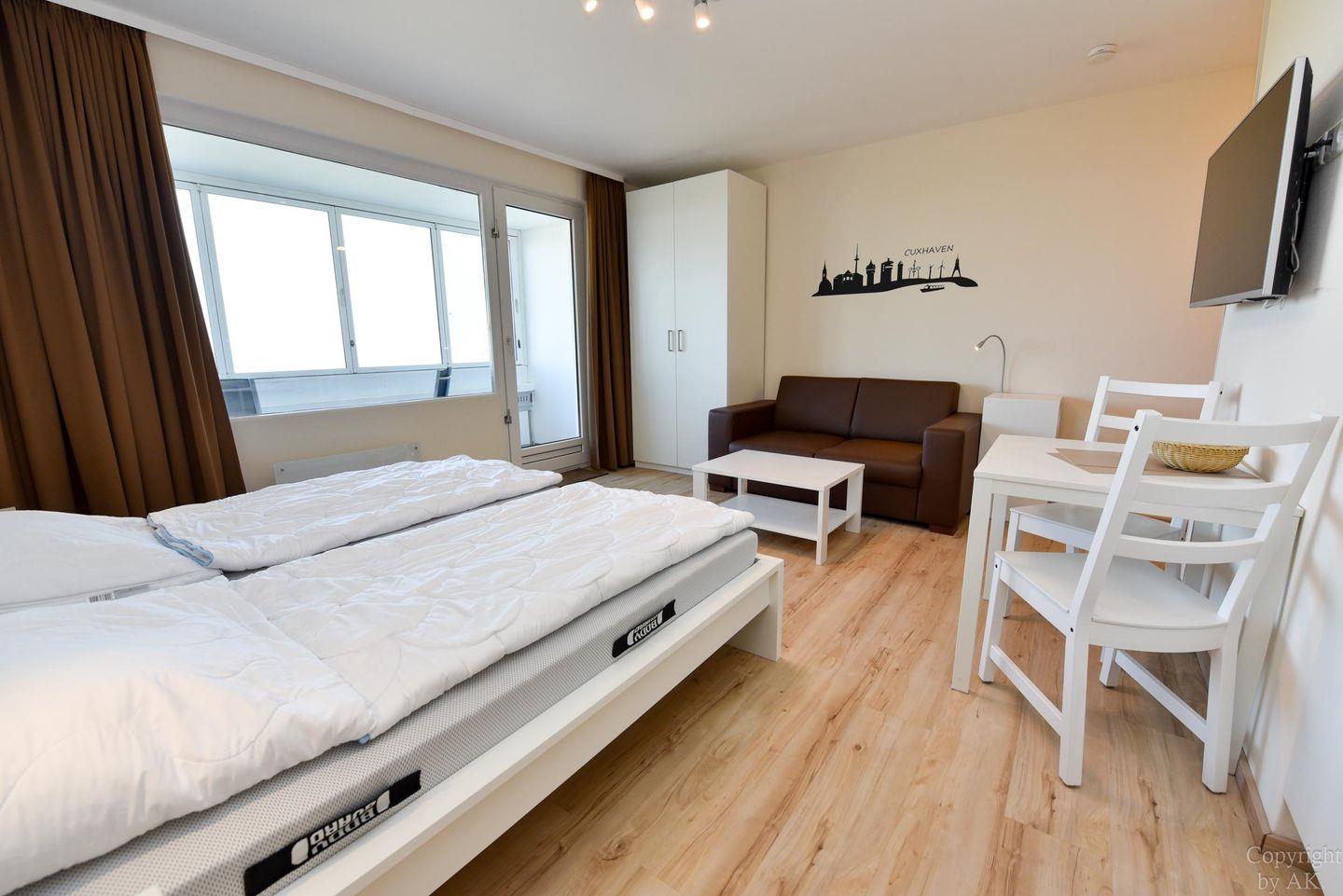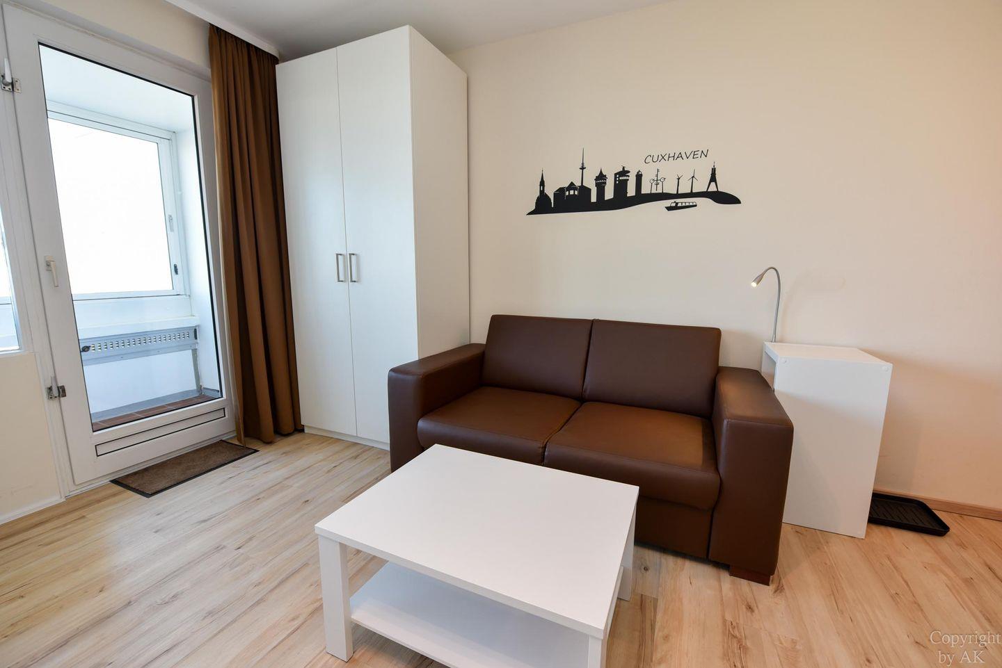 Helles und freundlich eingerichtetes 1-Zimmer Appartement mit gegen Wind und Wetter geschützten Balkon im 6. Stock im Haus "Atlantic", direkt hinter dem Seedeich in Cuxhaven-Dösen.