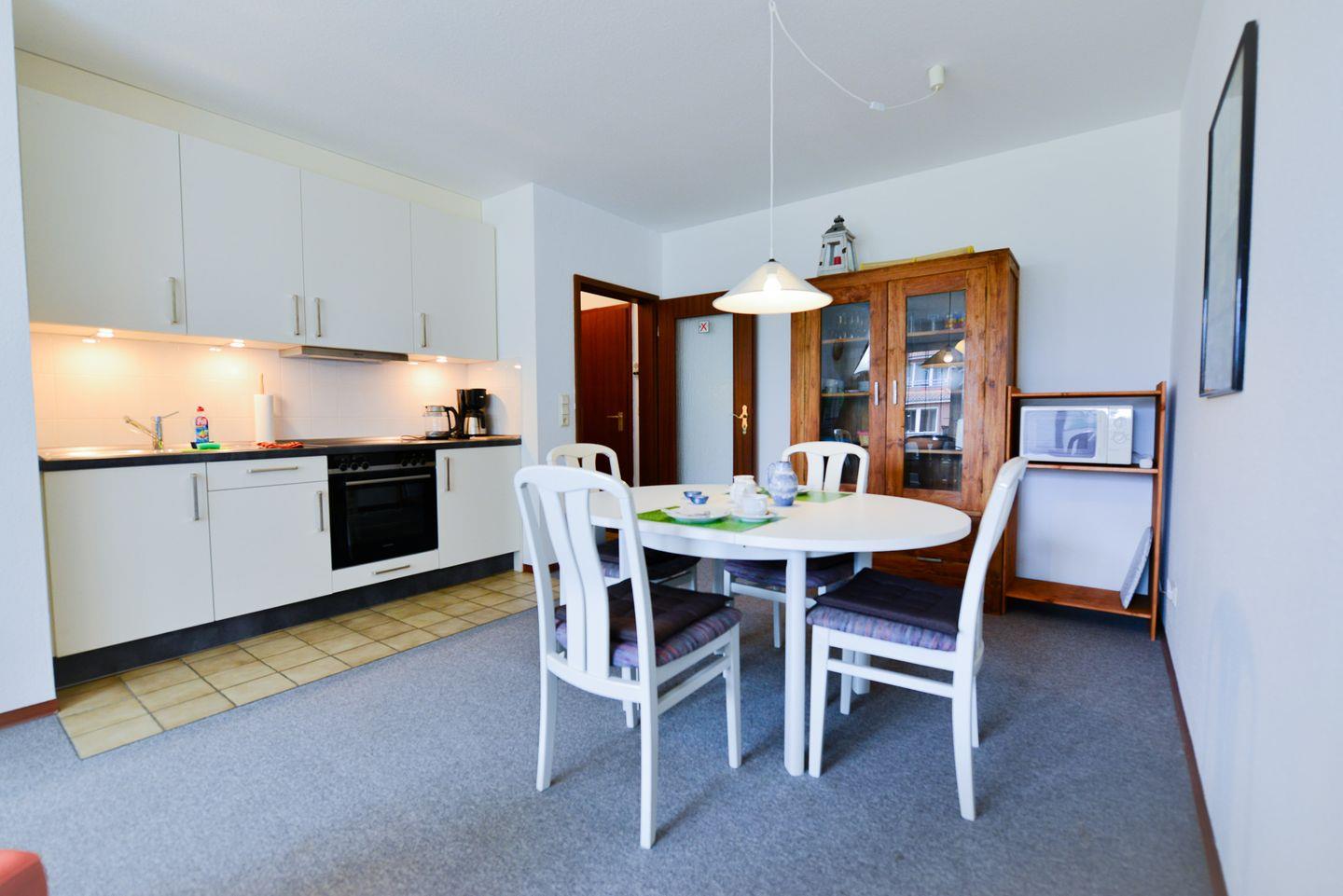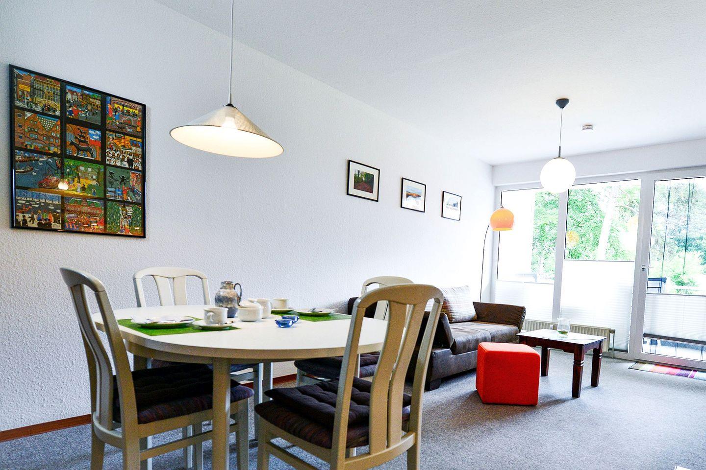 Gemütliche Hochparterre-Wohnung mit überdachtem Balkon, WLAN, Tiefgaragenstellplatz und Fahrradraum. Haustierfrei, Nichtraucher, voll ausgestattete Küche. Strandnah, ruhig, ideal für Familien und Senioren.