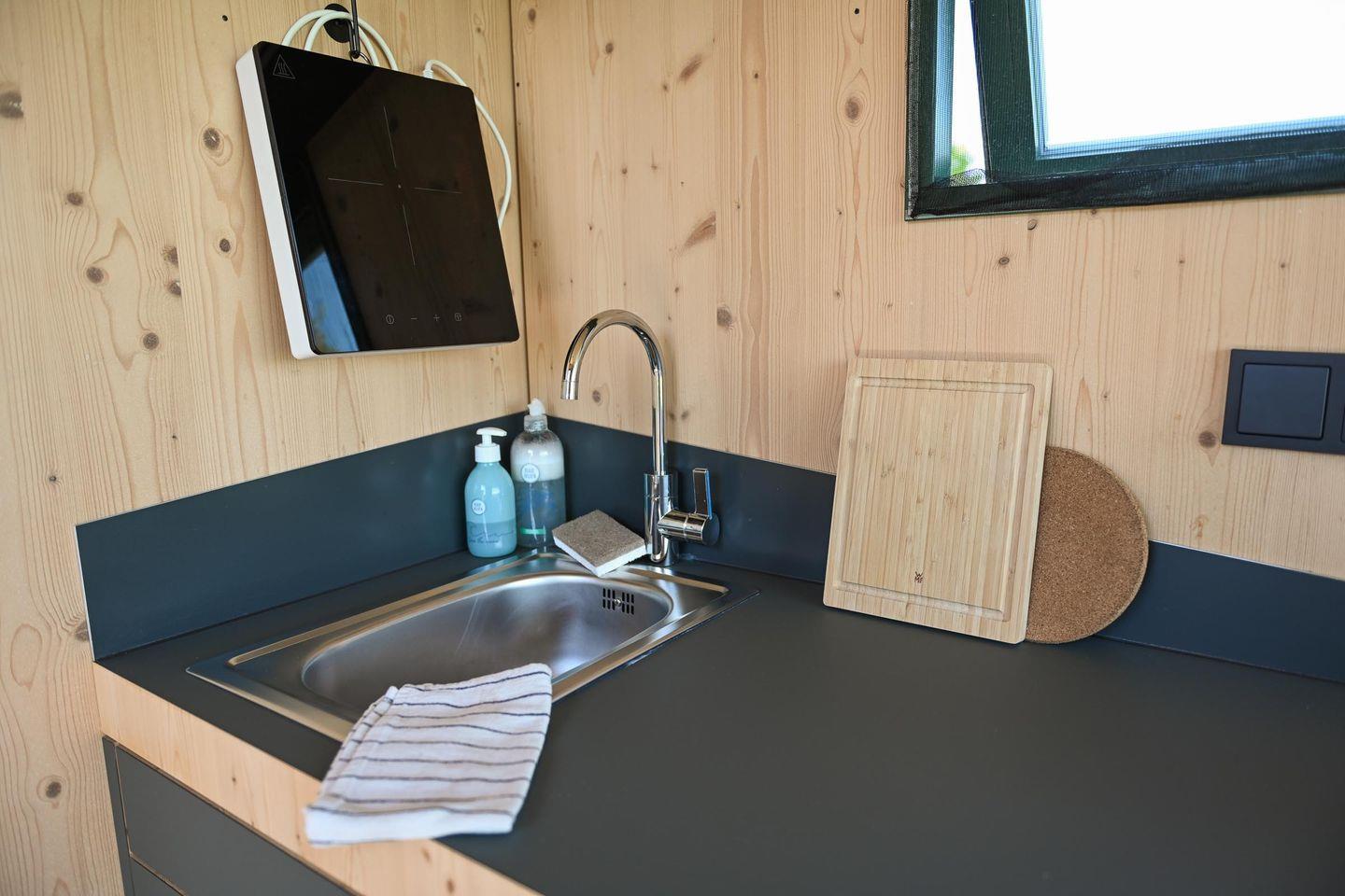 Die neuen Green Tiny Sleep Spaces sind ideal geeignet für Fahrradfahrer, Wanderer und andere Naturliebhaber, die nach einer nachhaltigen und stilvollen Übernachtungsmöglichkeit suchen. Auf fünf Quadratmetern findest du alles, was du für einen Kurzaufenthalt benötigst: ein komfortables Bett für zwei Personen, eine Kochnische mit Waschbecken und ausreichend Staumöglichkeiten. Duschen und Toiletten findest du in den Waschräumen auf dem Campingplatz. Die kleinen Geschwister der Green Tiny Houses vom Typ Pioneer werden ebenfalls in Schleswig-Holstein gebaut und bestehen ausschließlich aus wohngesunden Materialien. Außerdem bieten wir dir eine klimaneutrale Übernachtung dank Kompensation aller anfallenden CO2-Emissionen.