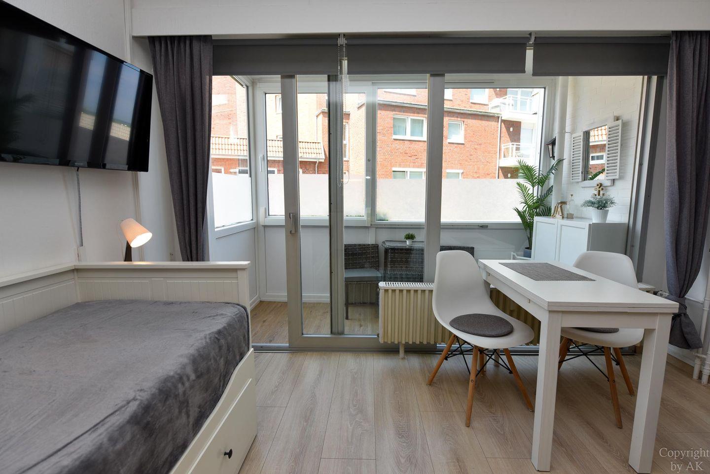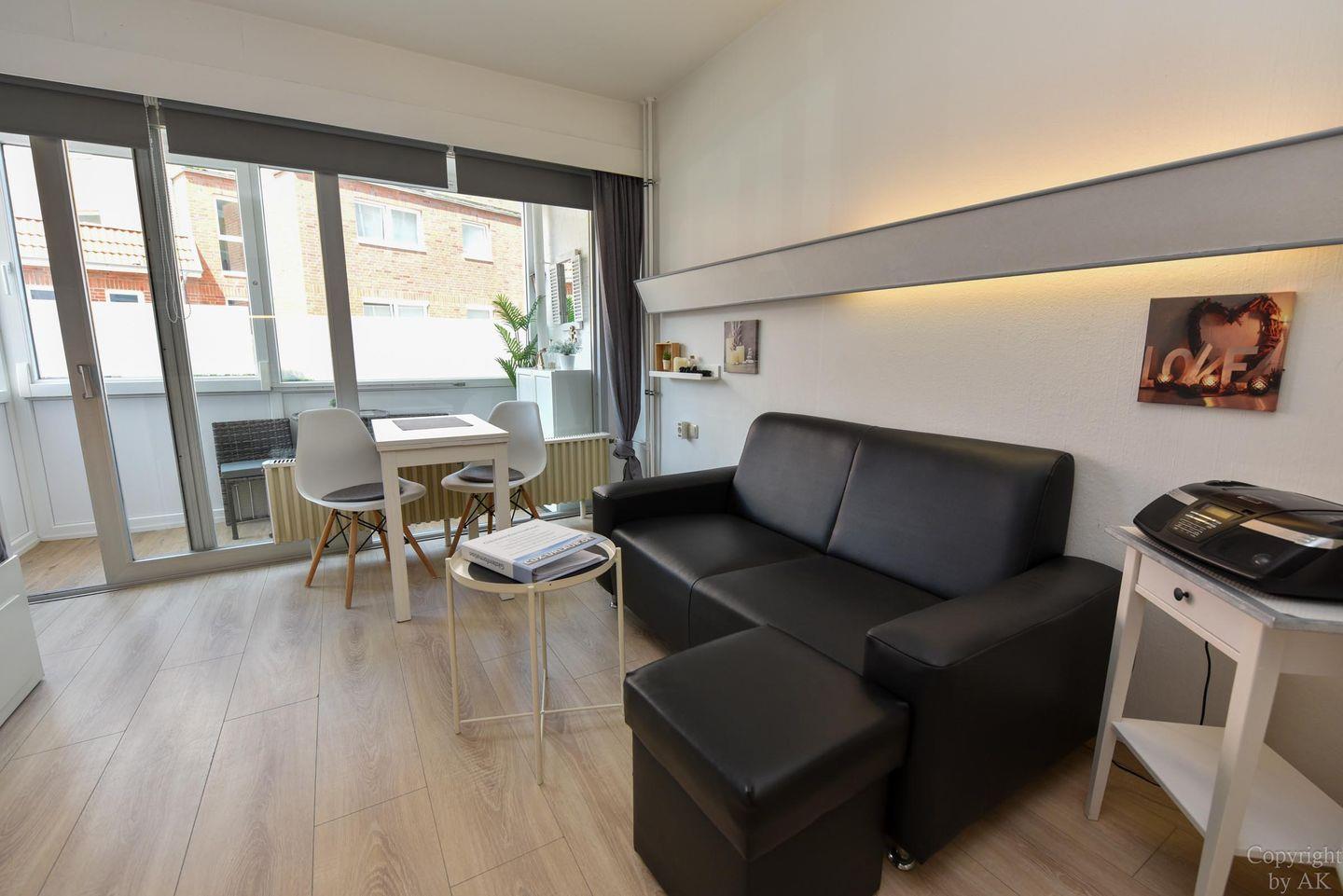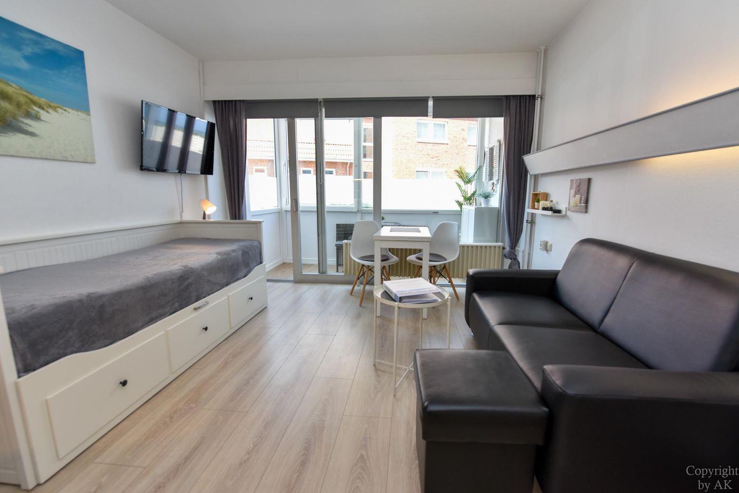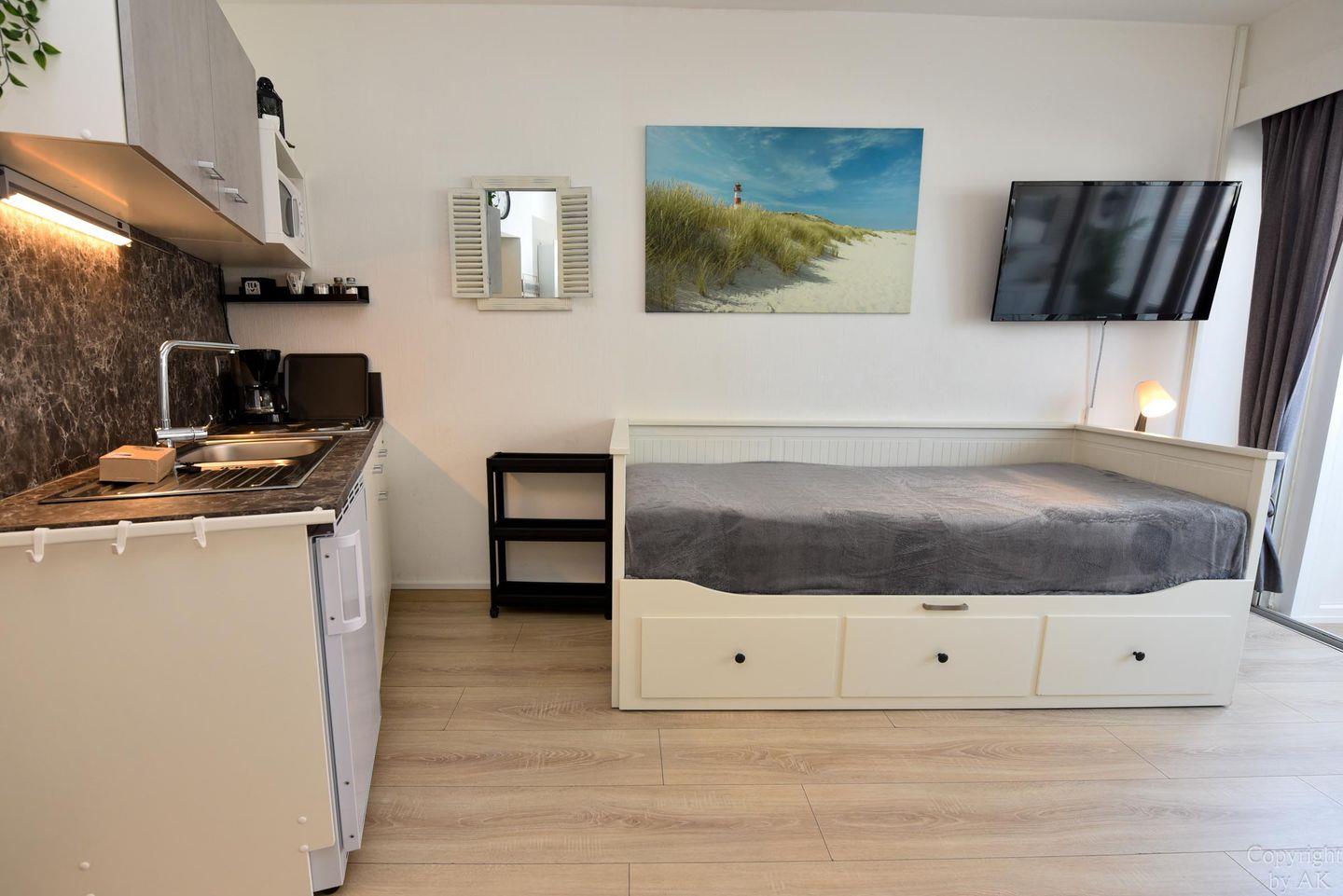 Moderne 1-Raum-Ferienwohnung "Seehütte 05" mit seitlichem Meerblick, direkt am Strand von Duhnen und nahe Thalasso Ahoi Bad.