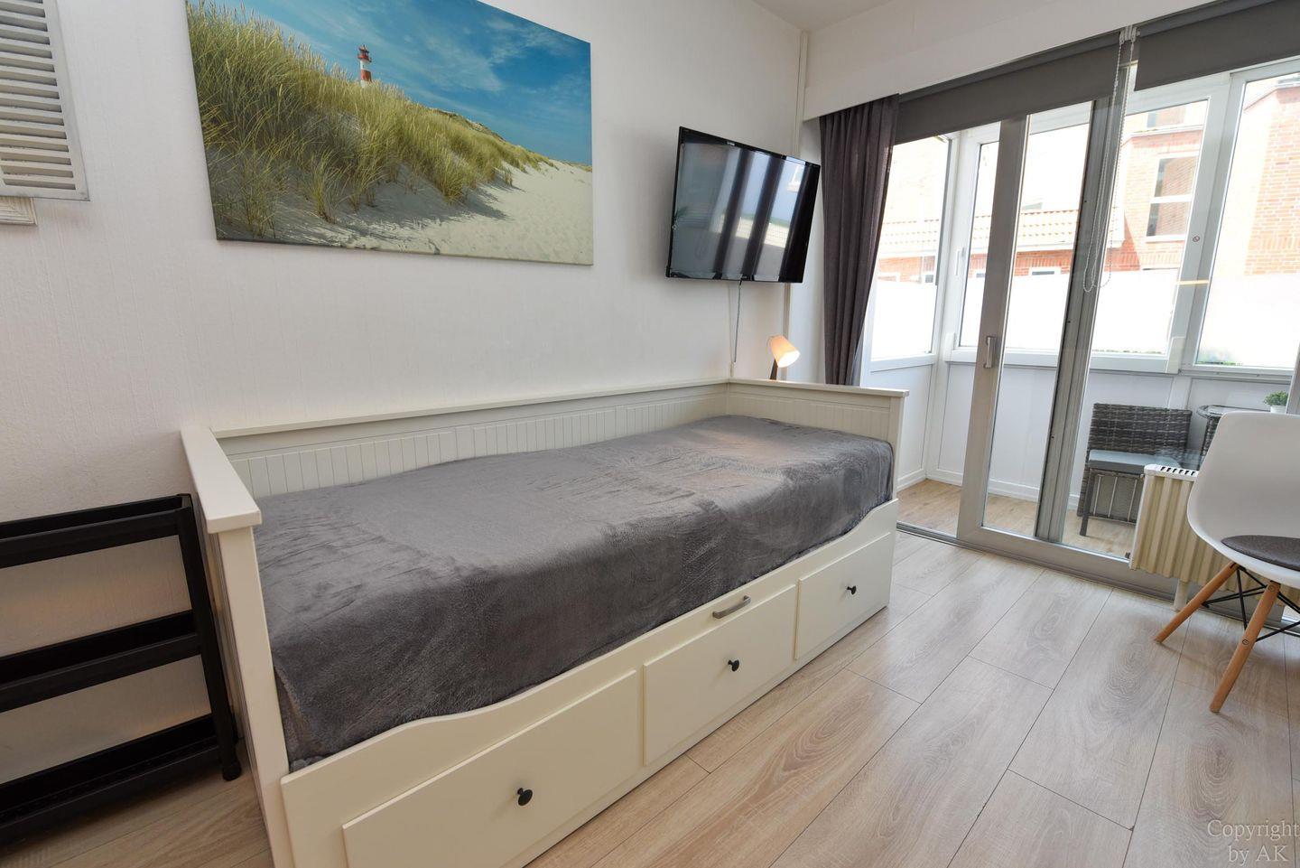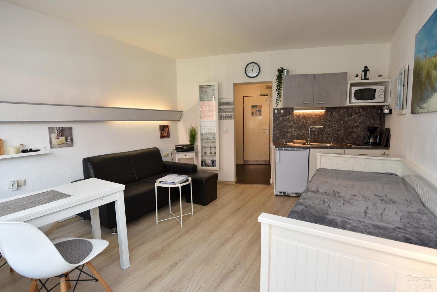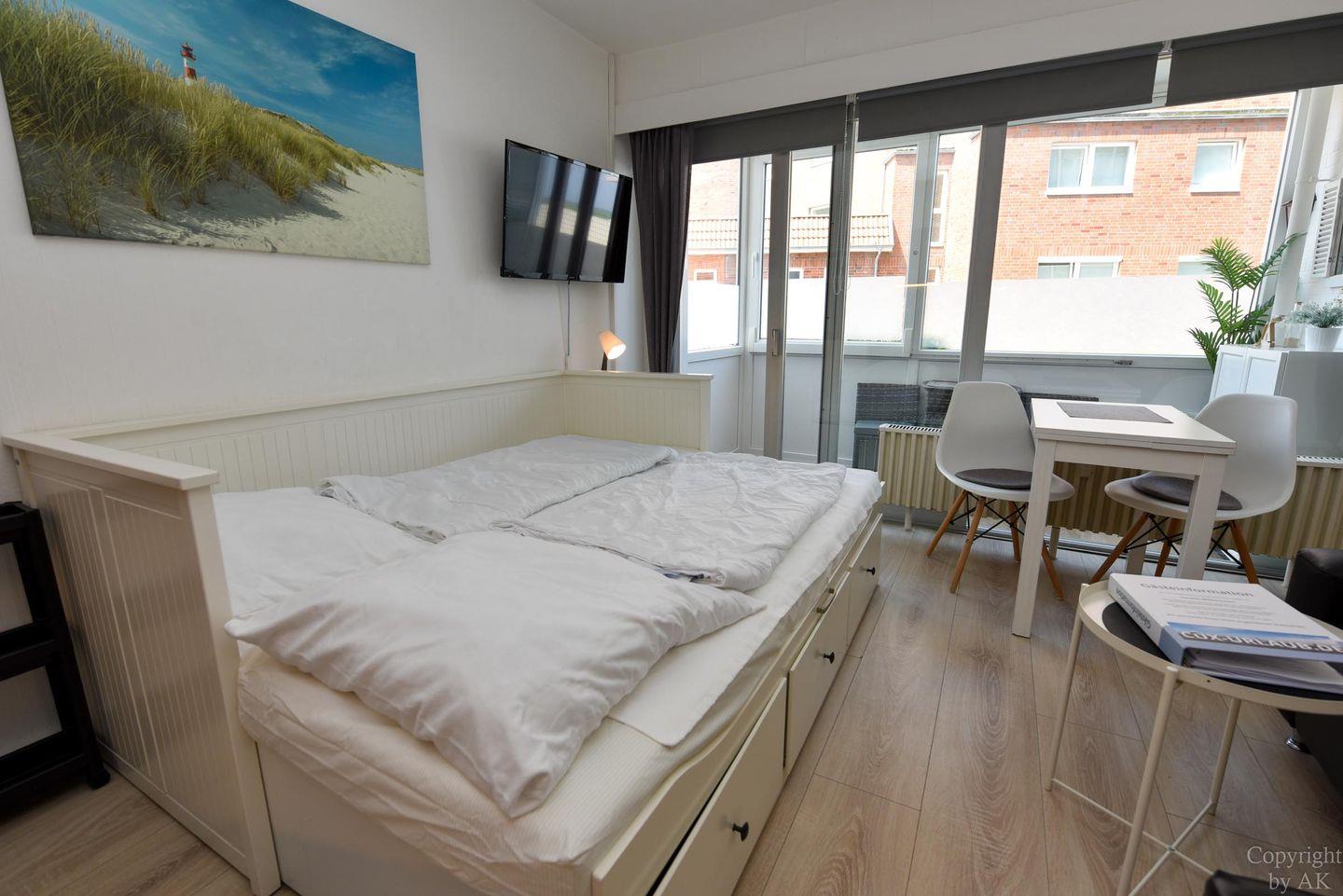 Moderne 1-Raum-Ferienwohnung "Seehütte 05" mit seitlichem Meerblick, direkt am Strand von Duhnen und nahe Thalasso Ahoi Bad.