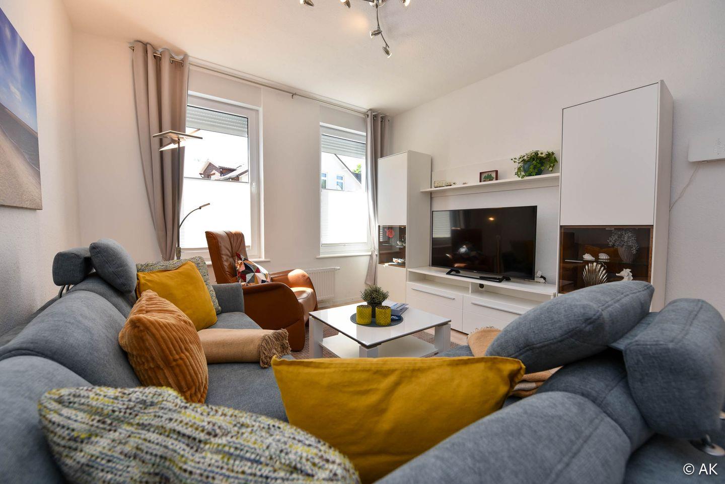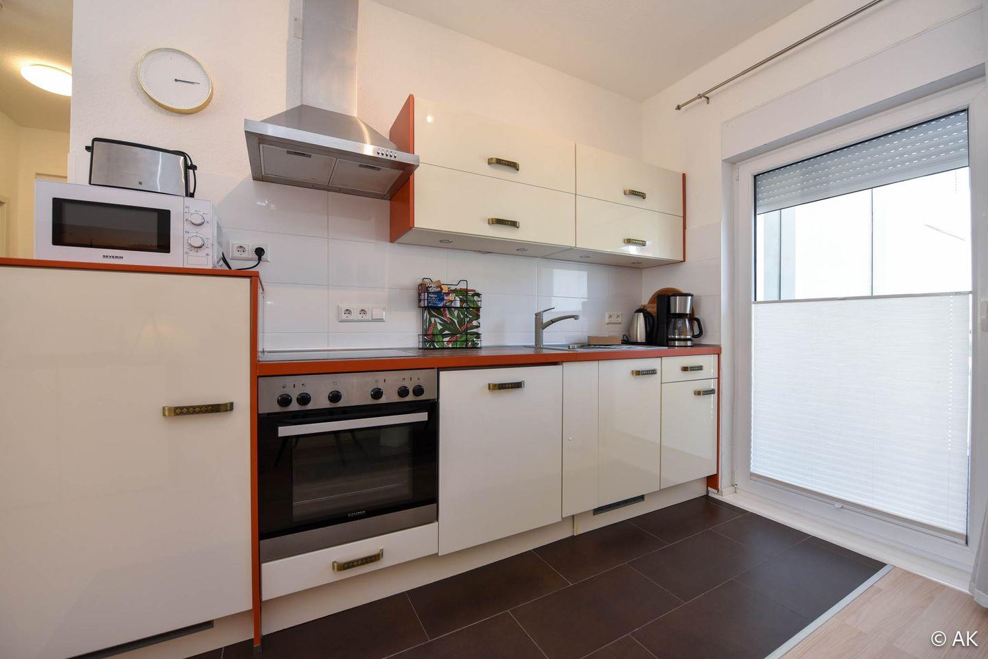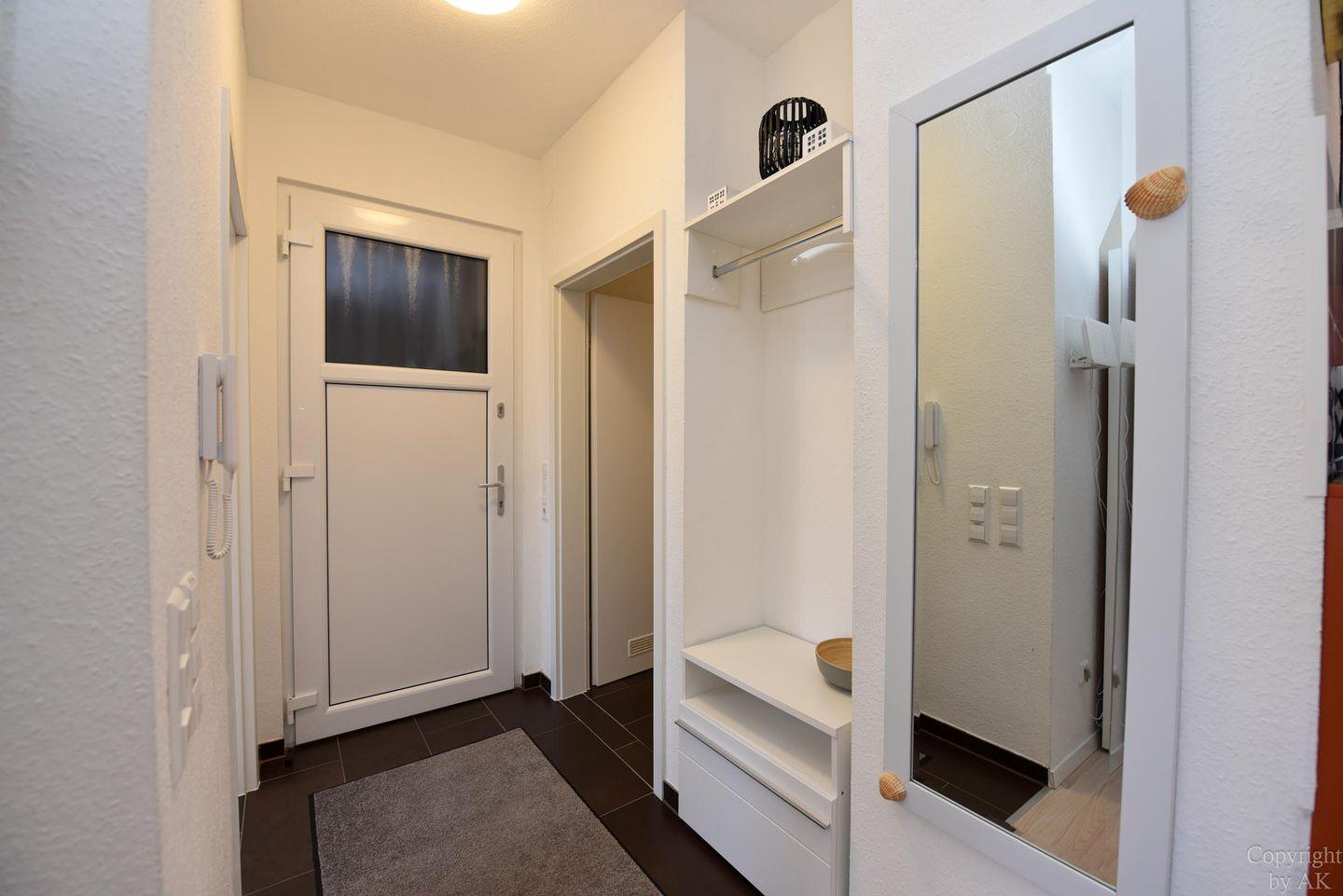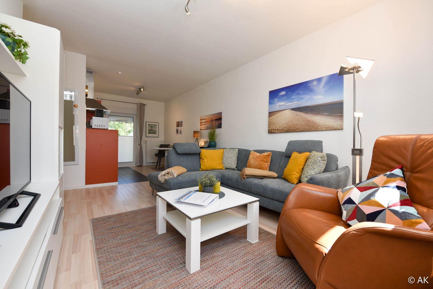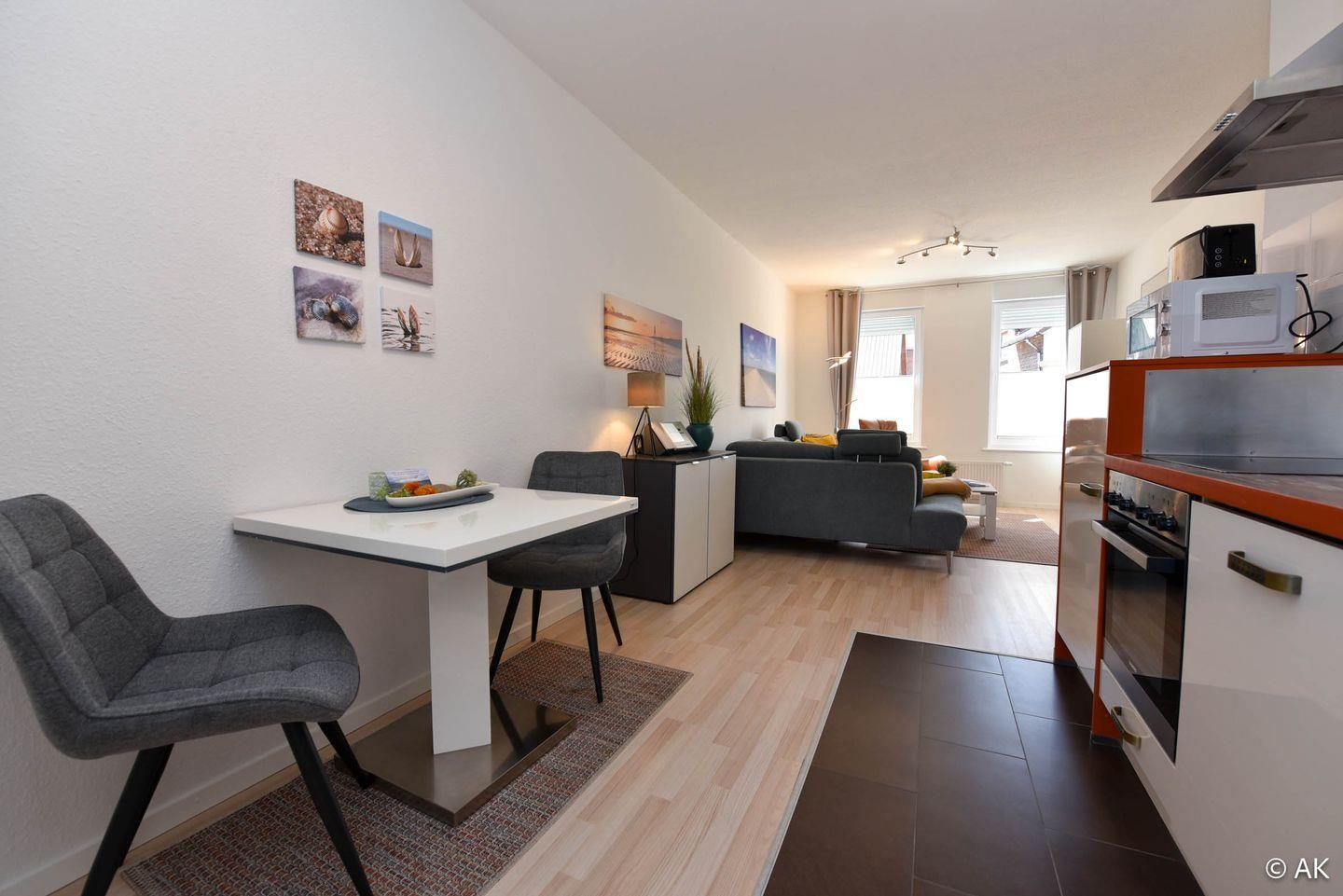 Die Ferienwohnung verfügt über eine Wohnküche mit Essbereich und einem gemütlichen Sofa im Wohnbereich. Das separate Schlafzimmer ist mit einem Doppelbett und einem großzügigen Kleiderschrank ausgestattet. Im modern gefliesten Badezimmer erwartet Sie eine bodentiefe Dusche.