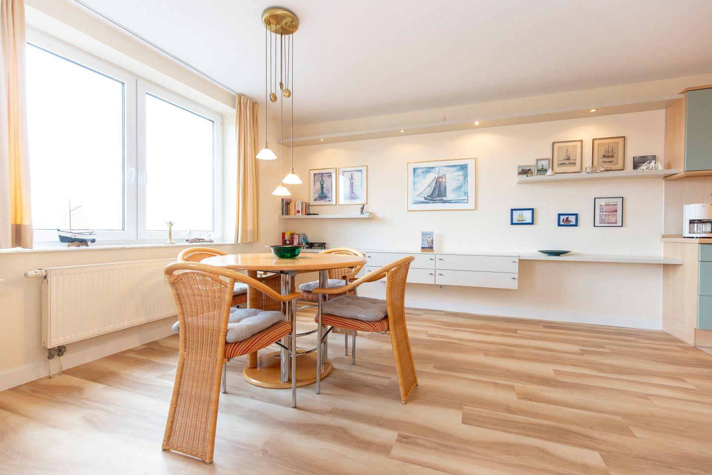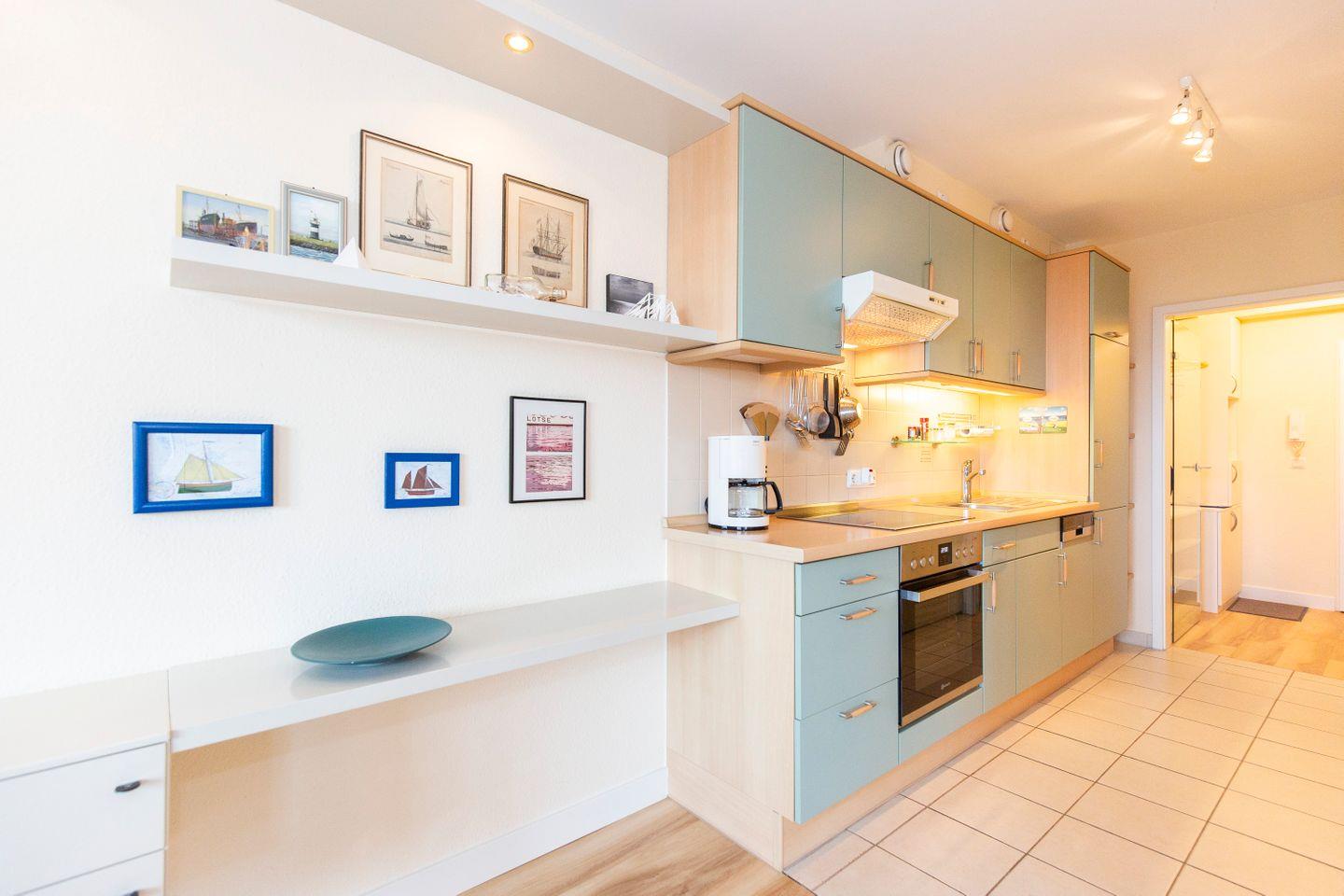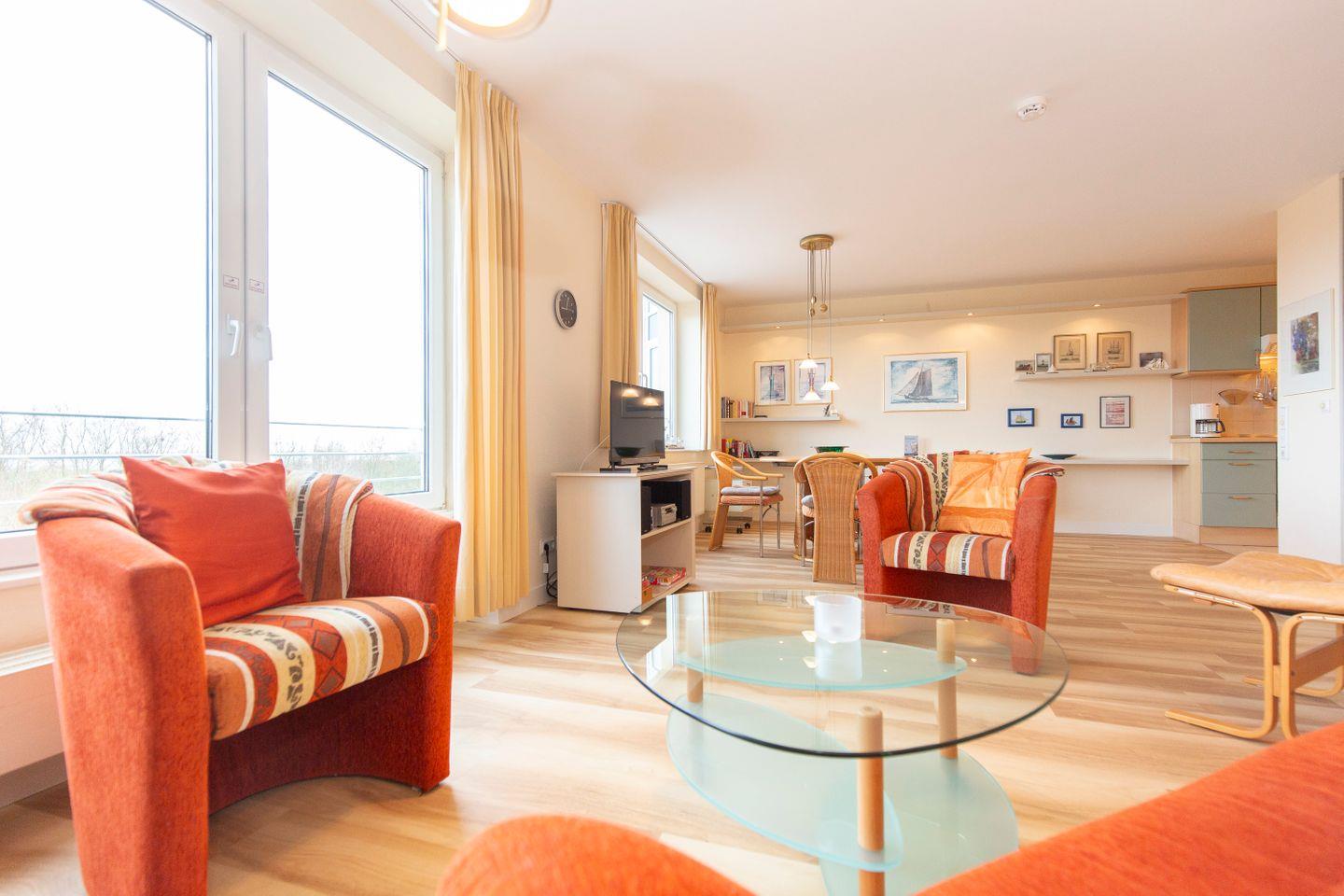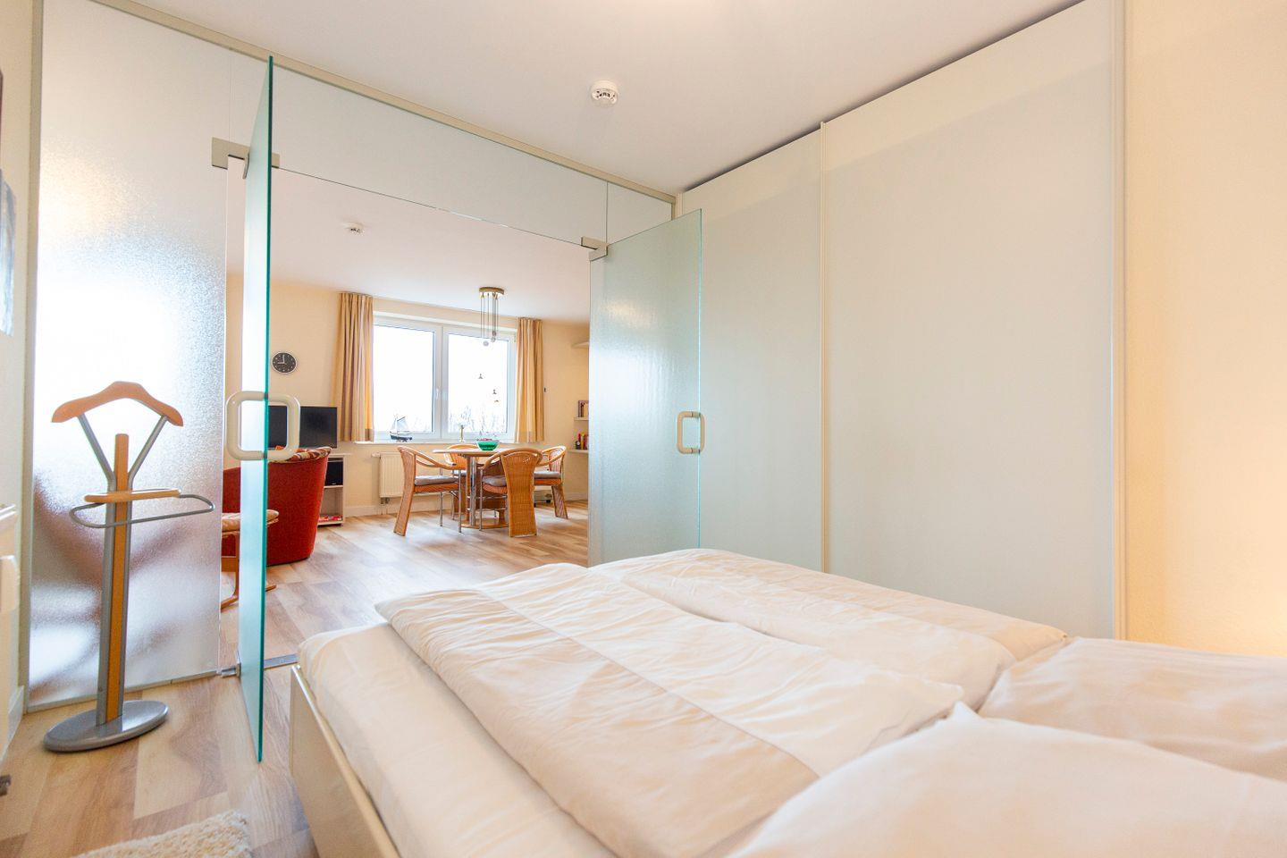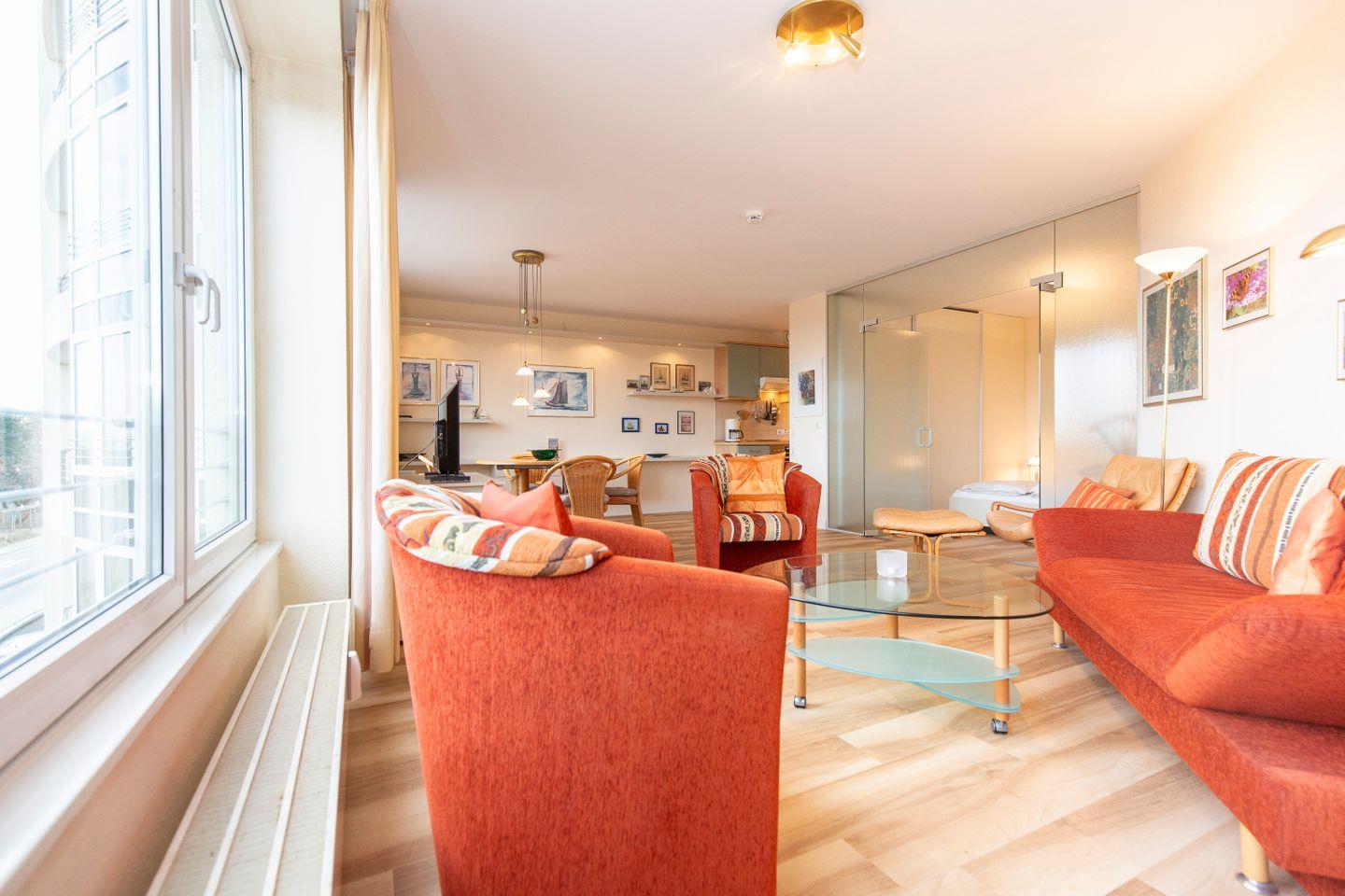Haus "Kurpark-Residenz", Typ C, Appartement-Nr. "240", bis 2 Personen, 2. OG, Nordseite (Seesicht Richtung "Elbe"), ca. 55 m² Wohnungsgröße, Wohnzimmer mit Couch, separates Schlafzimmer mit Doppelbett (innenliegend), Dusche/WC, Küchenzeile mit mit Backofen und Geschirrspüler, SAT-TV, WLAN, Tiefgaragenstellplatz, Nichtraucher.