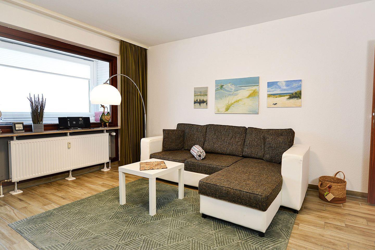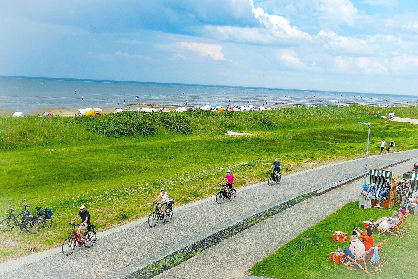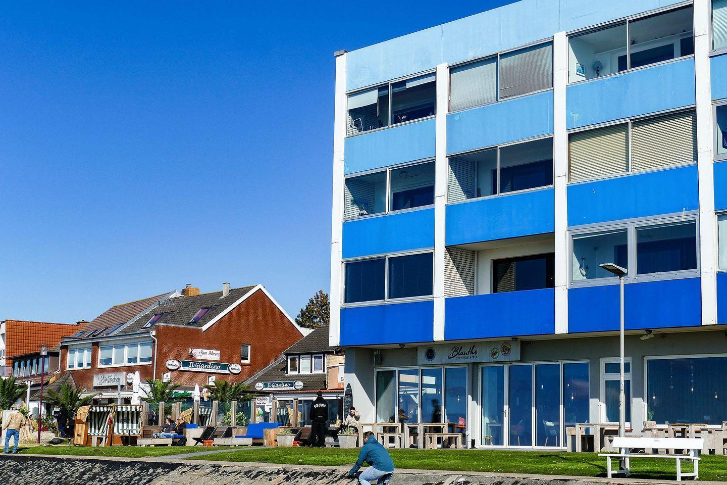 Die Ferienwohnung HD04 im Haus Seehund liegt direkt an der Strandpromenade von Cuxhaven-Sahlenburg – mit freiem Blick auf das Meer und die Insel Neuwerk.