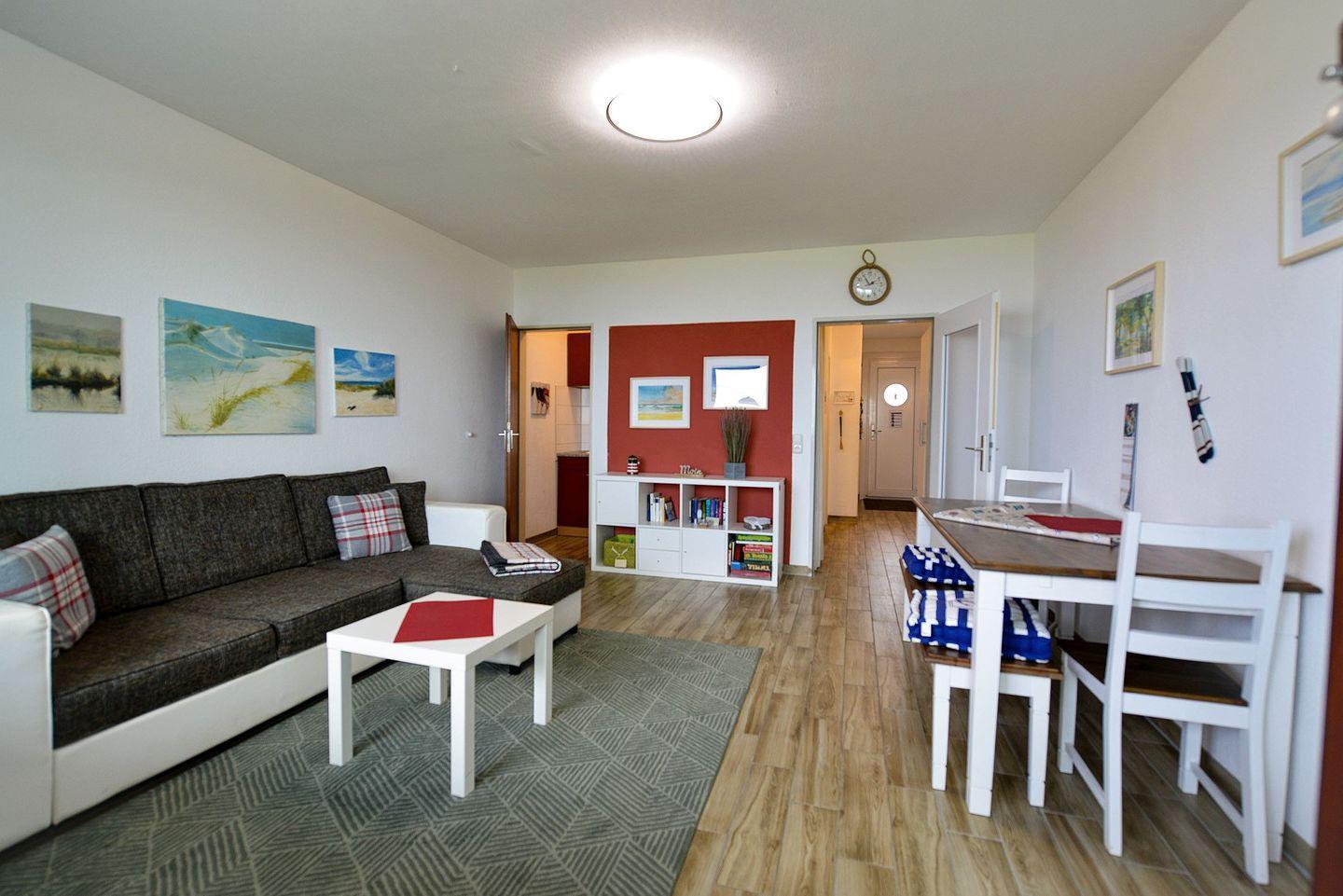 Ferienwohnung HD04 im Haus Seehund – Logenplatz an der Strandpromenade von Sahlenburg mit Blick auf das Meer und die Insel Neuwerk. Die 45?m² große Wohnung bietet ein separates Schlafzimmer, WLAN, TV, eine voll ausgestattete Küchenzeile und einen verglasten Balkon. Schwimmbad im Haus, Parkplatz direkt davor. 1. Etage, über Treppe erreichbar. Haustiere erlaubt. Restaurants, Wernerwald und ein saisonaler Bäcker direkt vor der Tür.