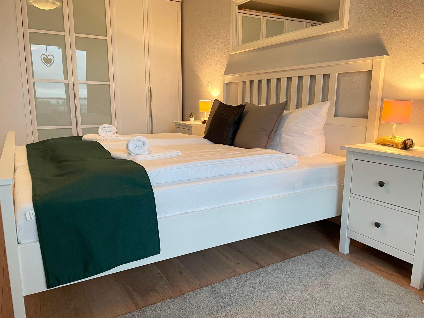 Das Schlafzimmer mit Doppelbett verspricht erholsame Nächte.