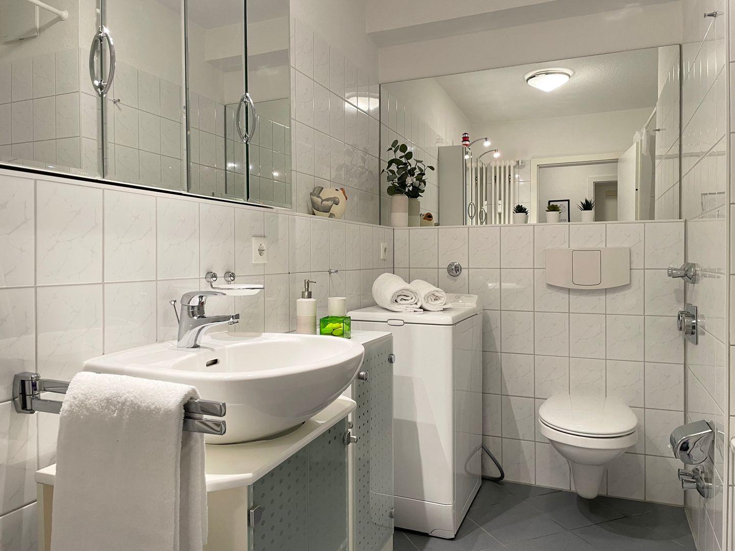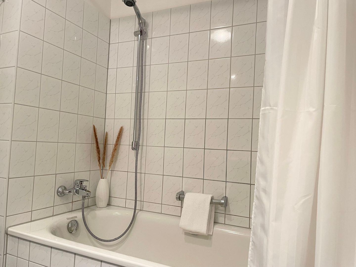 Das Bad verfügt über eine Badewanne in der sie bei einem entspanntem Schaumbad oder einer Dusche den Tag ausklinken lassen können.