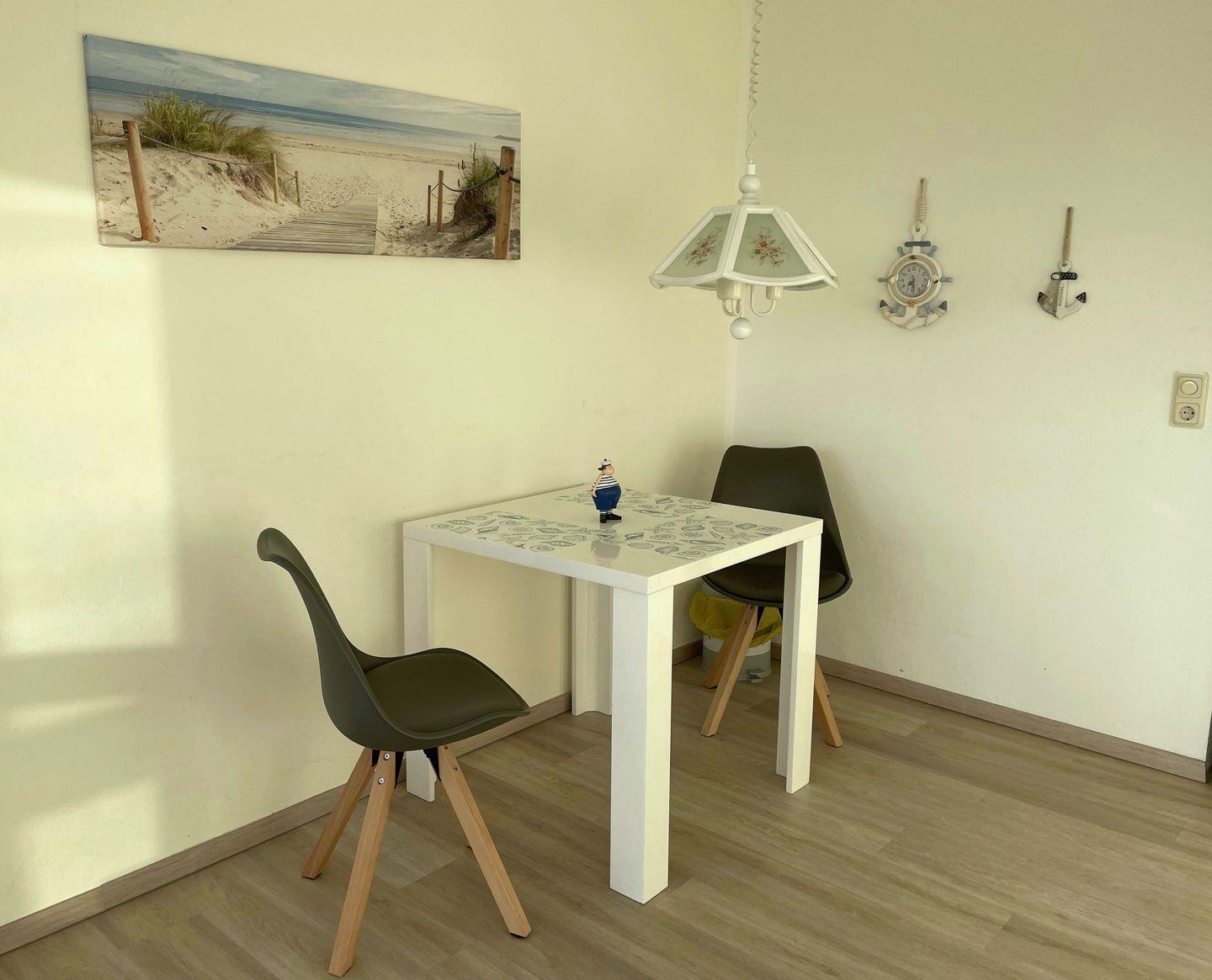 Die kleine, aber gut ausgestattete Küchenzeile mit Backofen ermöglicht es Ihnen, sich selbst zu verpflegen und den Tag mit einem köstlichen Frühstück zu beginnen oder abends ein leichtes Mahl zuzubereiten. Genießen Sie Ihre Mahlzeiten auch gerne auf dem geräumigen Balkon, wo Sie die frische Meeresluft und den Blick auf die Nordsee in vollen Zügen auskosten können.