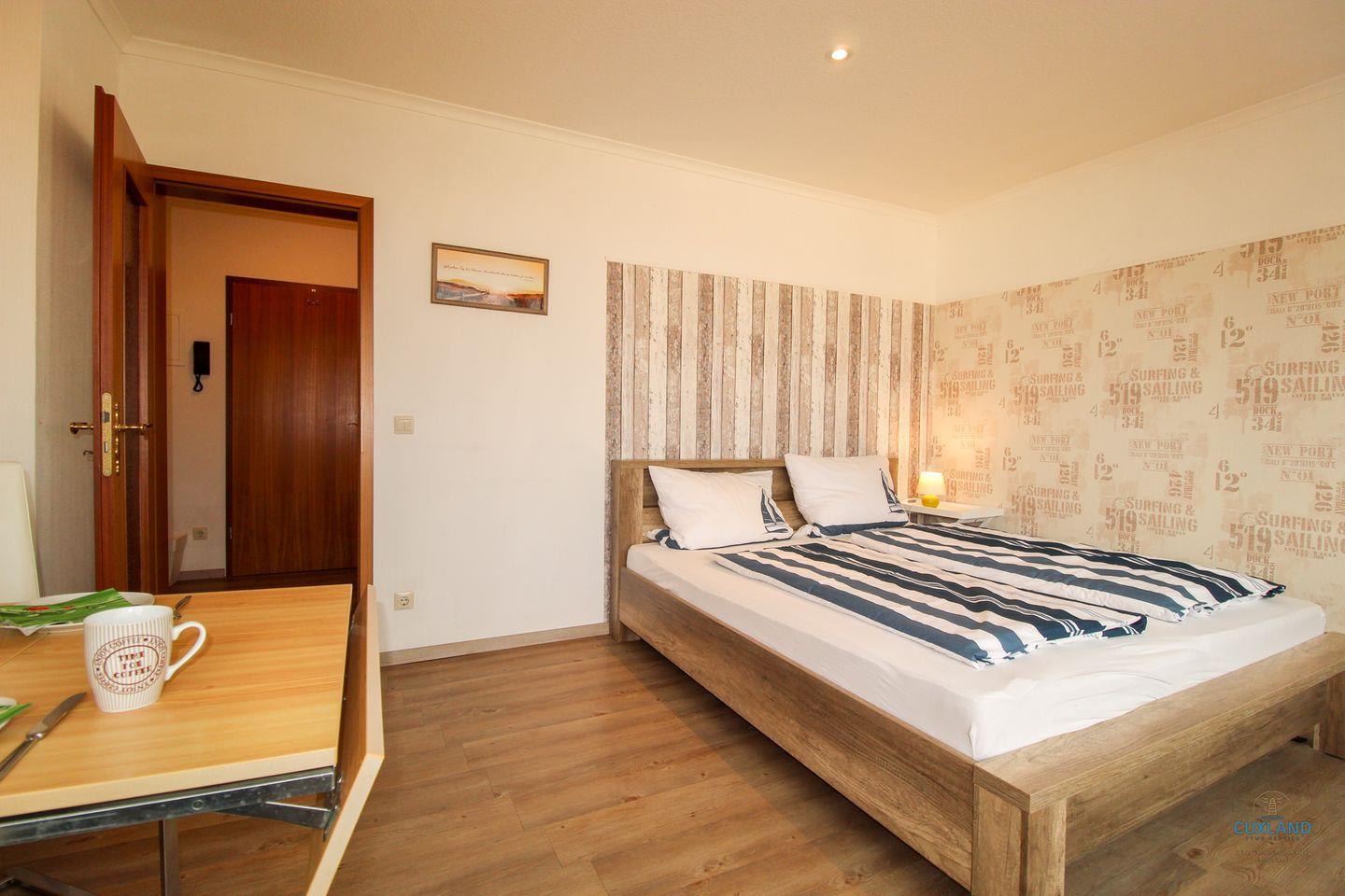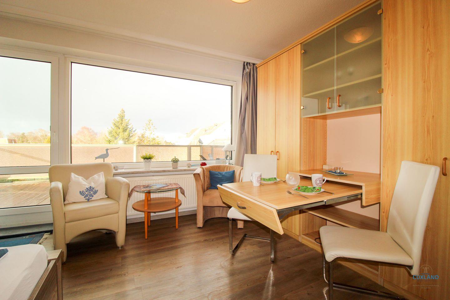 Gemütliches 29qm Ferienappartement in der 2. Etage des Haus Elbe in Döse. Wohn- und Schlafraum mit Blick auf die großzügige Terrasse. Kleine, gut ausgestattete Küche für Frühstück oder Snacks. Geräumiges Badezimmer in maritimem Blau. Kostenfreies WLAN und Parkplatz vor dem Haus.