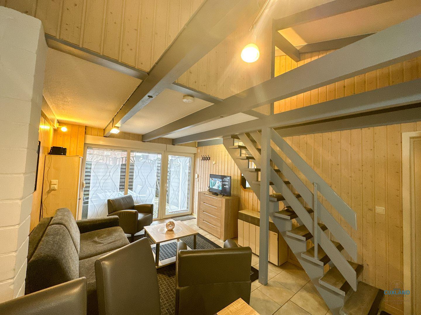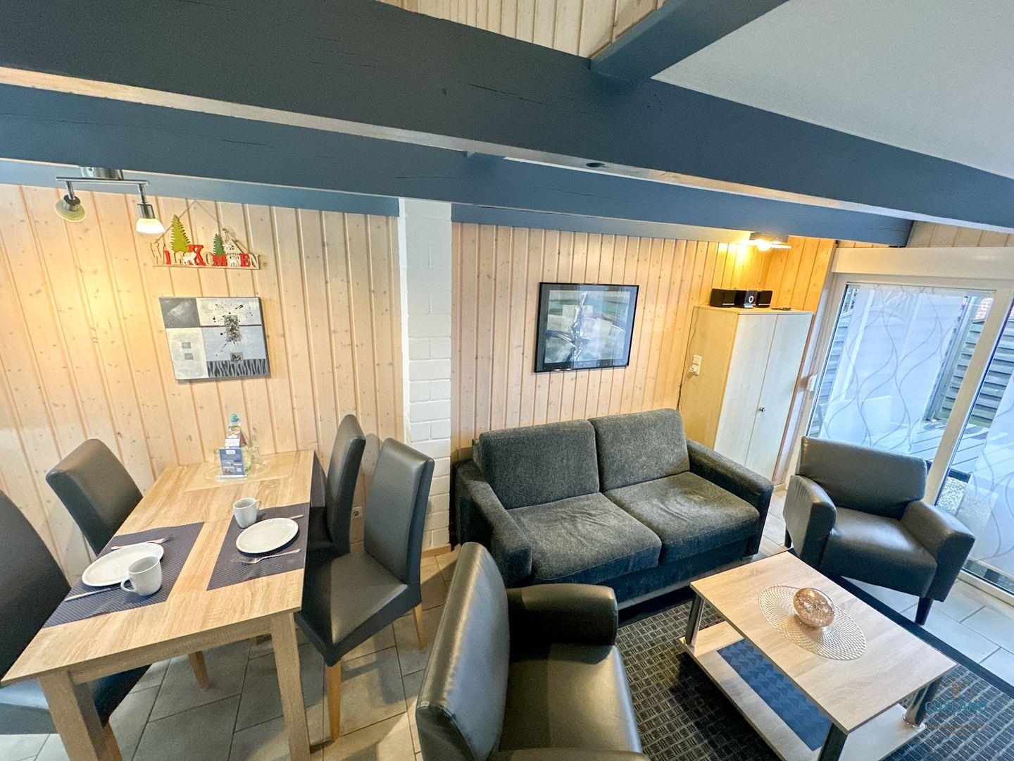 In diesem 40qm großen Ferienhäuschen finden bis zu 3 Personen Platz. Auf zwei Ebenen erstreckt sich das Haus, wobei sich das gemütliche Schlafzimmer mit einem zusätzlichen TV im oberen Bereich befindet. Der Wohn- und Essbereich mit offener Küche im unteren Bereich bietet Zugang zur großen Sonnenterrasse mit Terrassenmöbeln. Ein reservierter Parkplatz gehört ebenfalls zum Haus.
