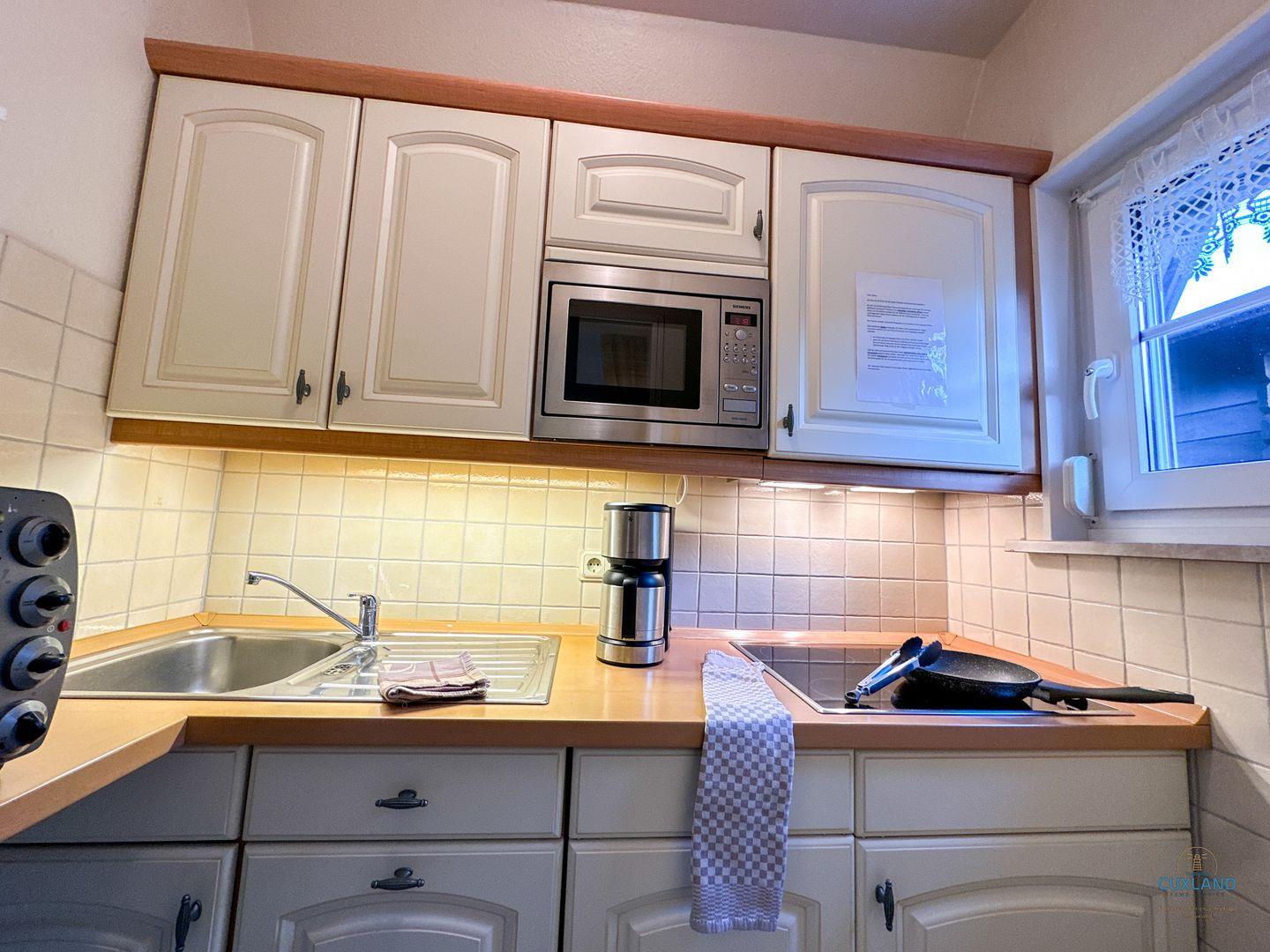 - Cerankochfeld, Backofen, Kühlschrank mit Gefrierfach, Mikrowelle, Spülmaschine, Kaffeemaschine, Wasserkocher, Toaster