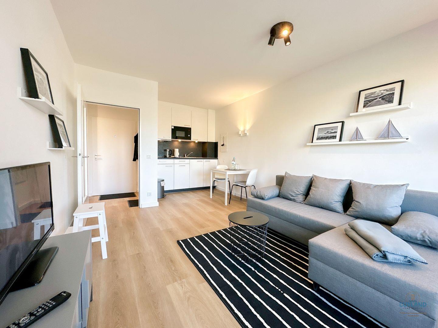 hellen Wohnbereich mit einer praktischen Schlafcouch. Die offene Küche lädt zum