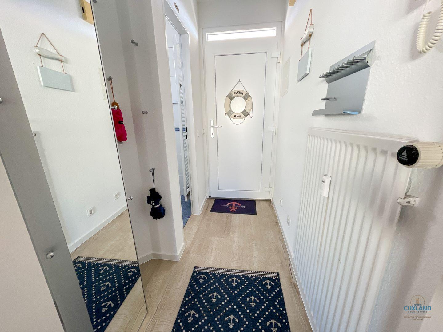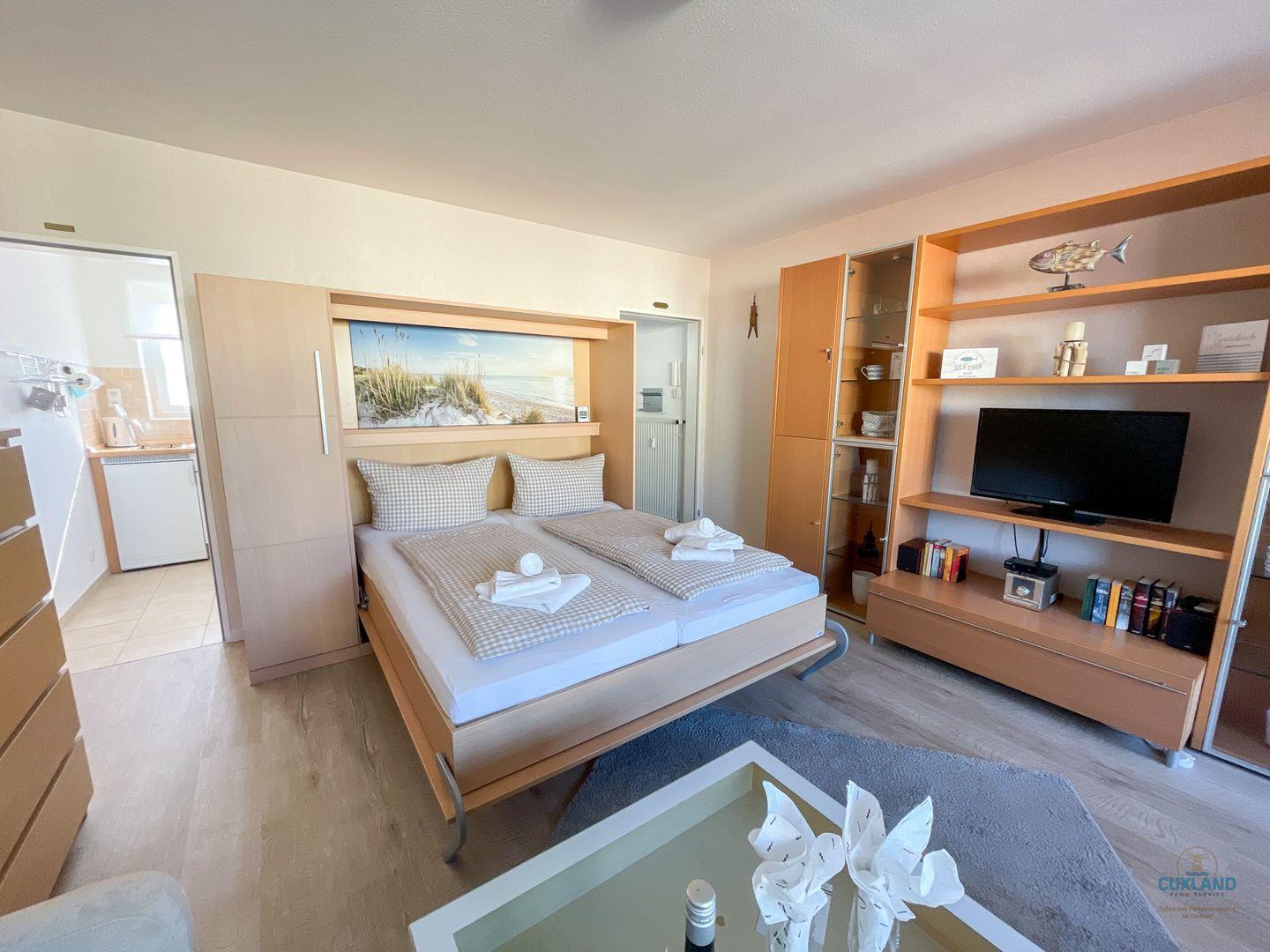 Das 35qm Apartment im Haus Alte Liebe bietet einen einzigartigen Blick auf den Weltschifffahrtsweg. Der Wohn-Schlafraum hat ein Schrankklappbett, eine kleine Küche und ein Bad mit Dusche. Der geschlossene Balkon erlaubt das Beobachten der vorbeiziehenden Schiffe. Die 4. Etage-Wohnung bietet kostenloses WLAN und einen Tiefgaragenparkplatz. Das Haus Alte Liebe liegt am Seedeich, etwa 300m vom Hafen entfernt, mit fußläufigen Einkaufsmöglichkeiten und einer Bushaltestelle.