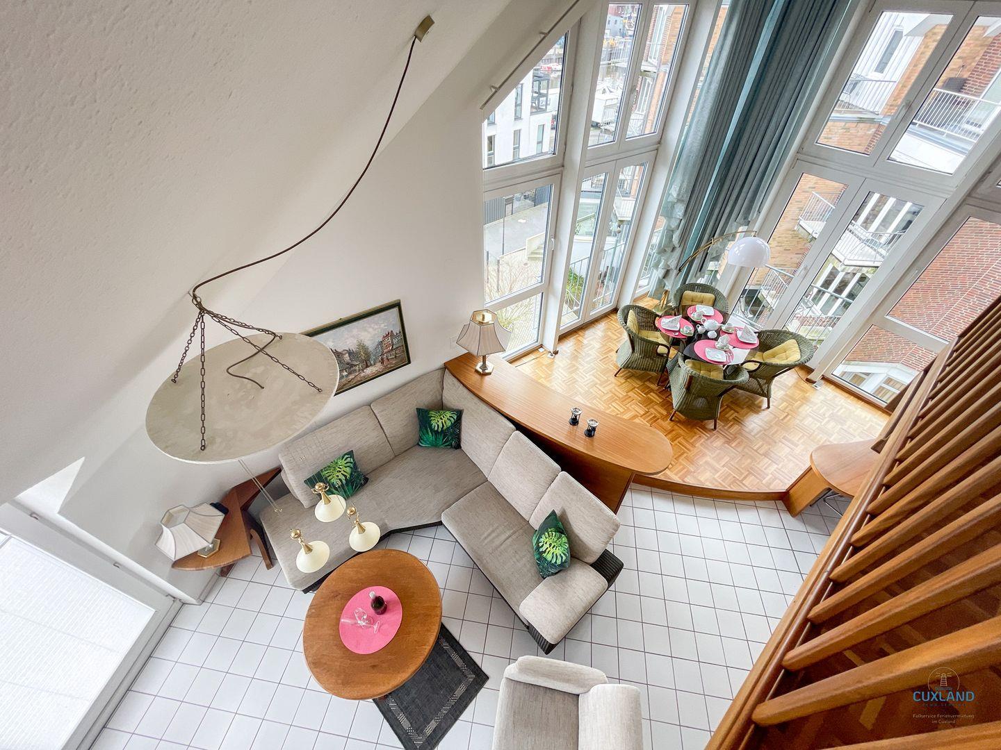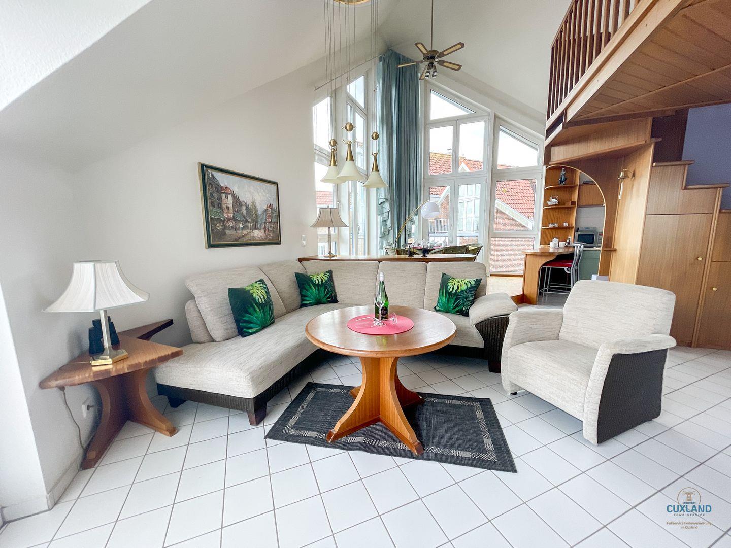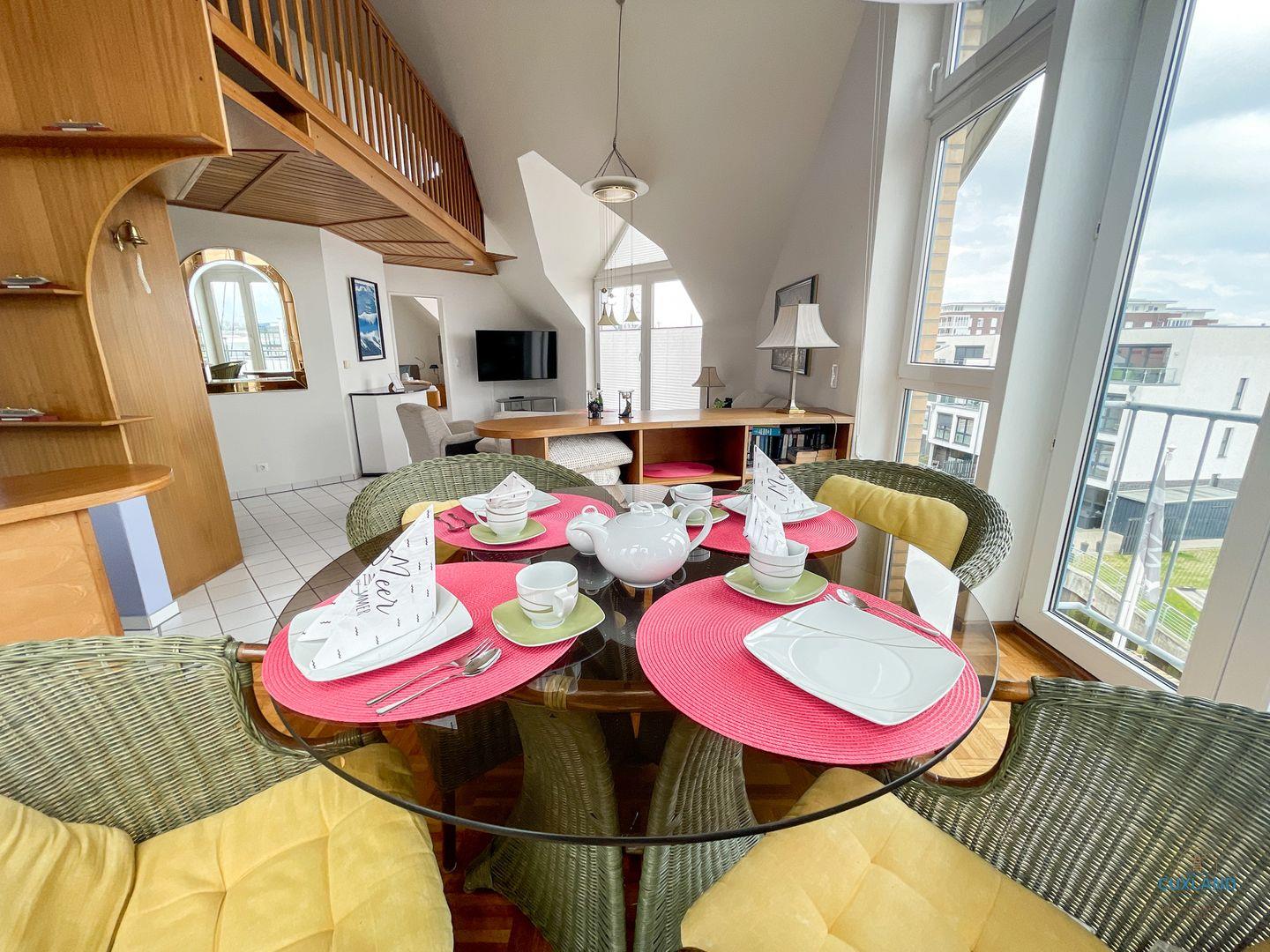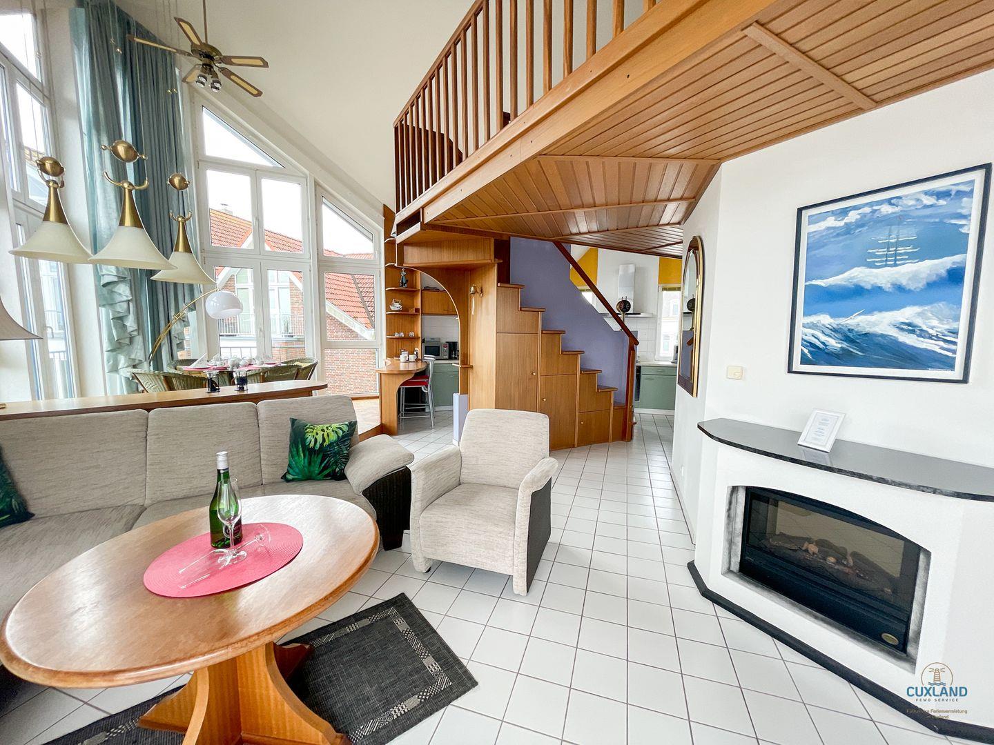 Exklusive Ferienwohnung mit Hafenblick in Cuxhavens City Marina, komfortabel und modern auf zwei Ebenen mit Balkon und Relaxbereich.