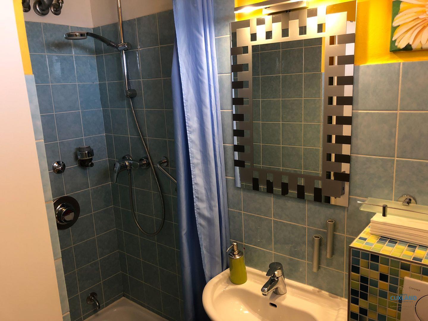 - Badezimmer mit Dusche, Waschbecken und WC – funktional und gepflegt