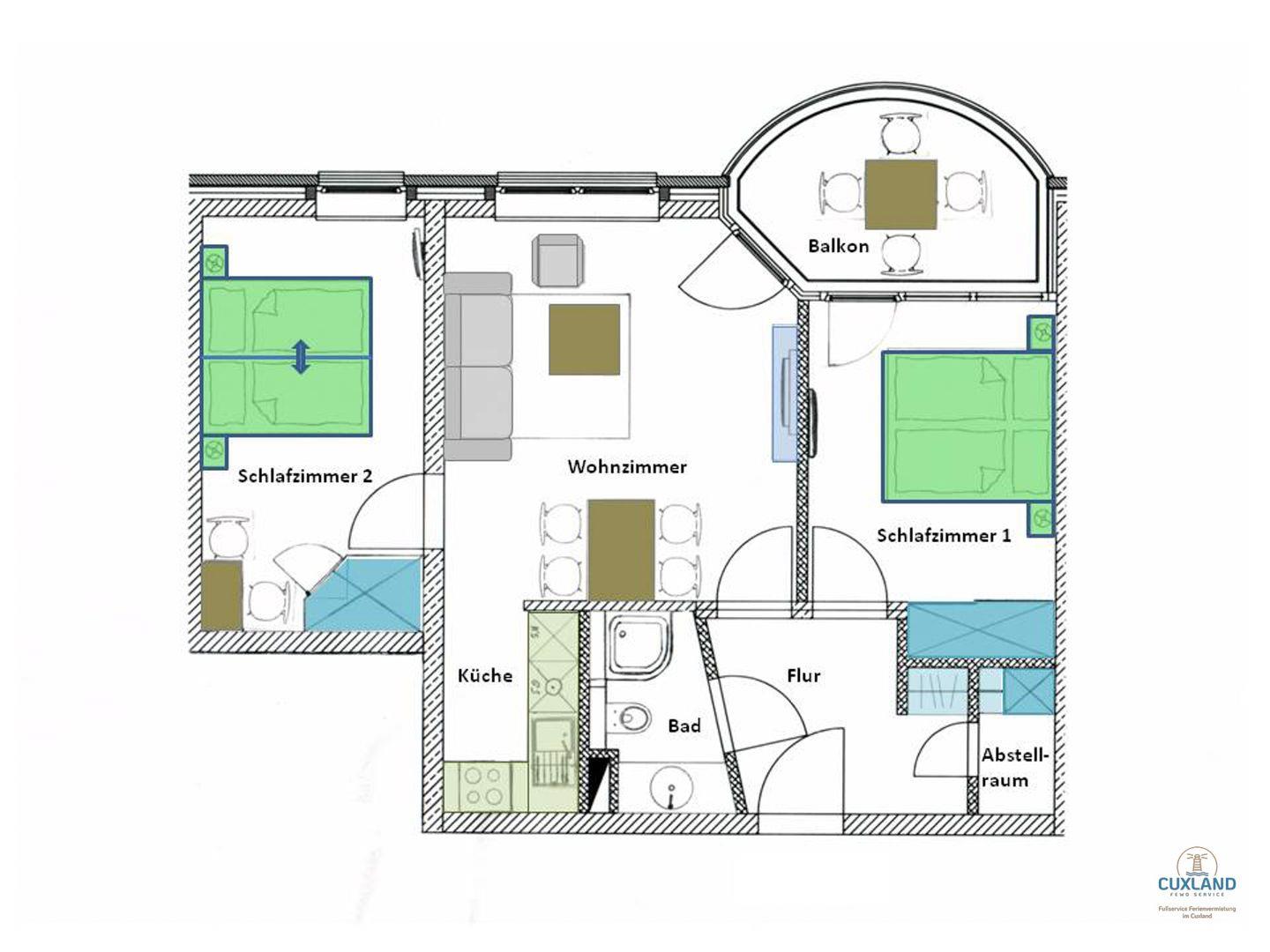 Komfortable Ferienwohnung in bester Lage von Duhnen! Diese 62qm große Wohnung bietet Platz für bis zu 5 Personen. Zwei geräumige Schlafzimmer, eine Schlafcouch im Wohnzimmer und ein Westbalkon mit Blick auf die ruhige Gartenanlage bieten erholsame Möglichkeiten. Die gut ausgestattete Küche und kostenfreies WLAN sind vorhanden. Ein reservierter PKW-Stellplatz in der Tiefgarage sowie ein Strandkorb am Duhner Strand (Mai bis September) ergänzen das Angebot.