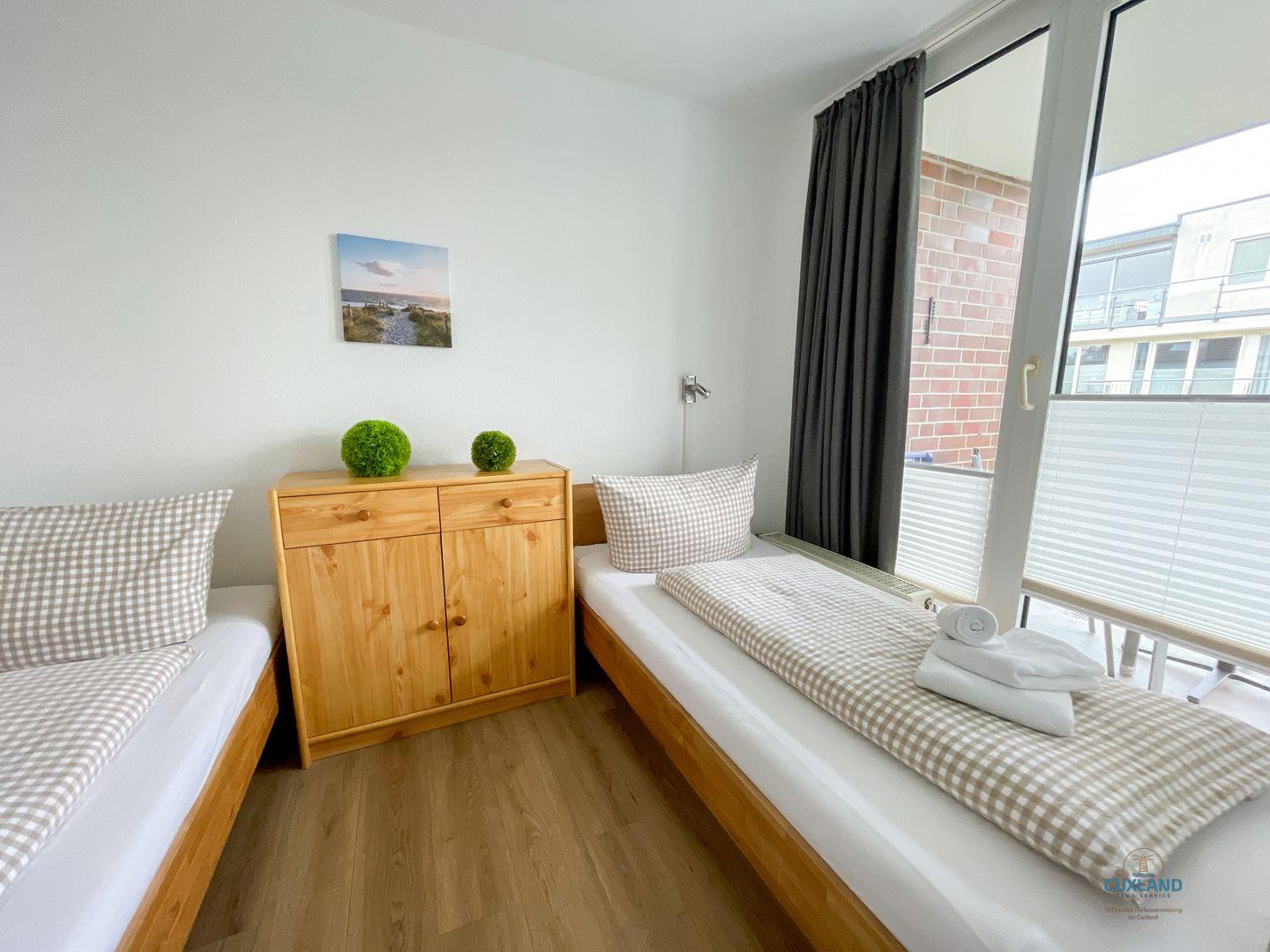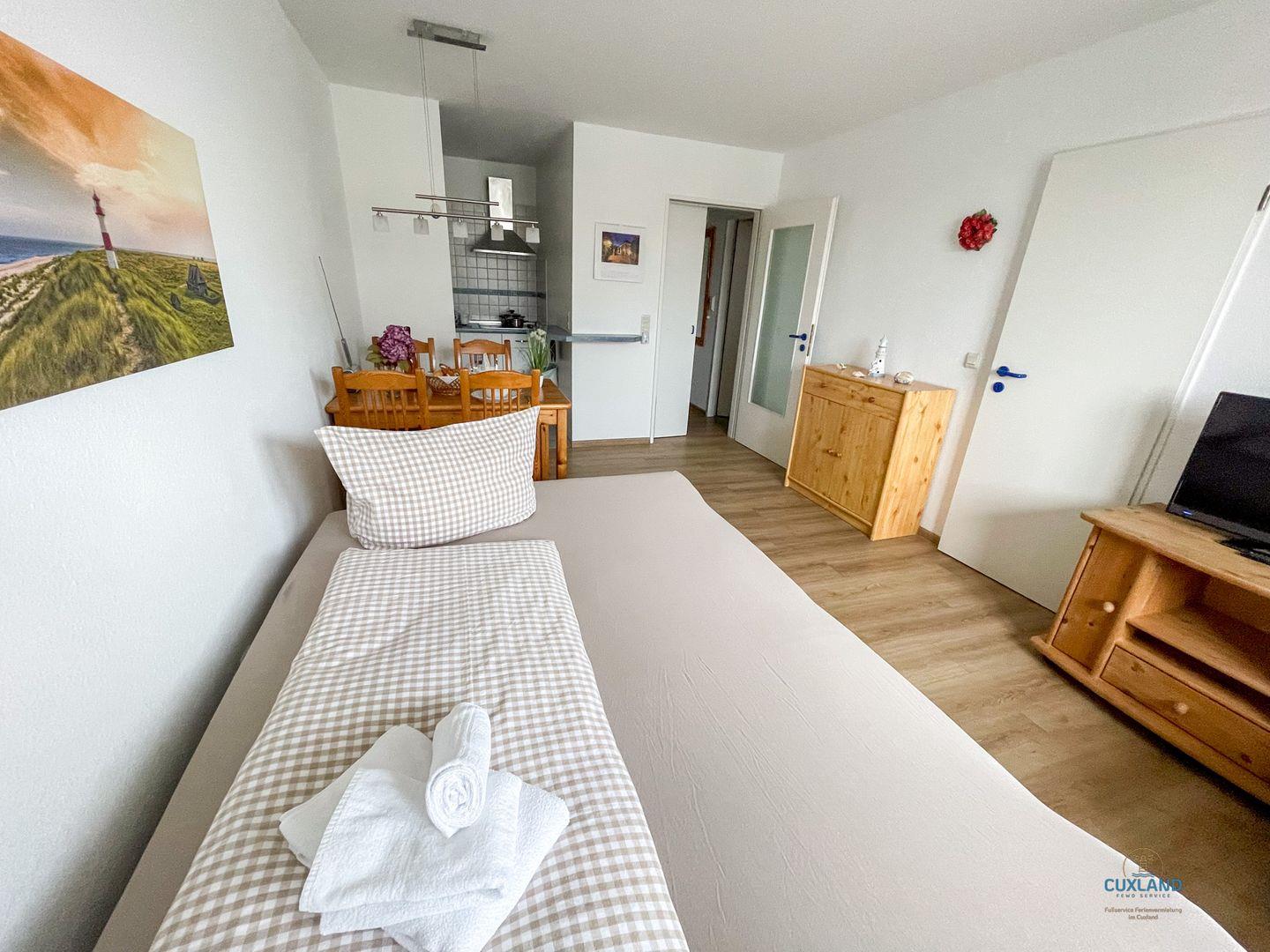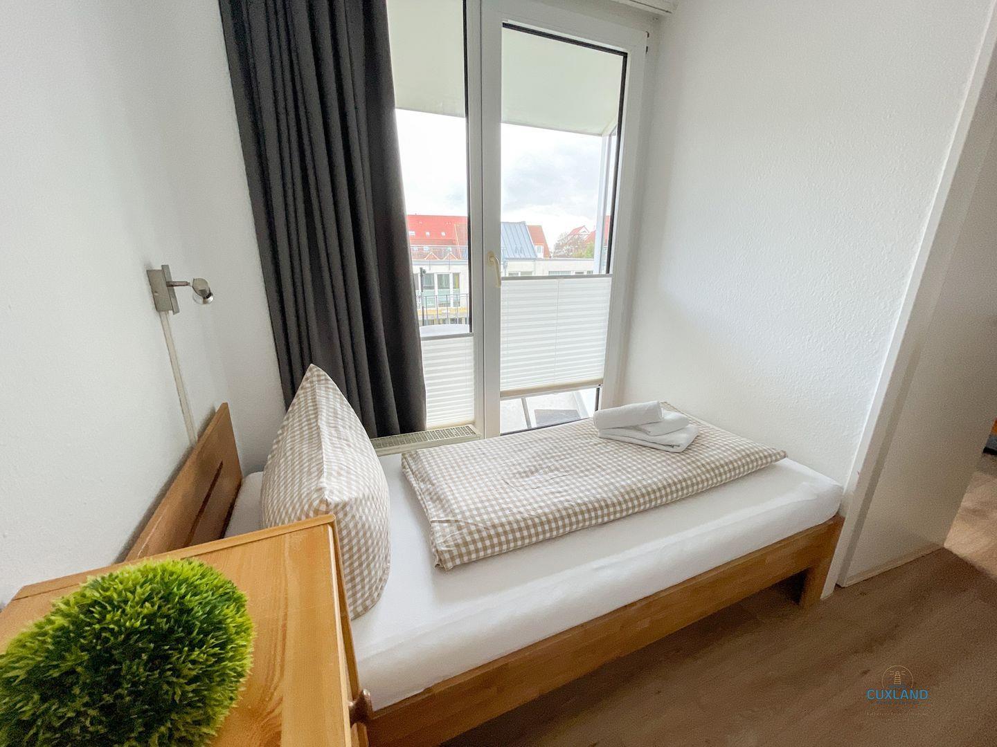 Diese maritime 40qm große Wohnung befindet sich in der 3. Etage der Residenz Hohe Worth. Sie bietet euch ein helles Schlafzimmer mit 2 Einzelbetten und eine Schlafcouch im Wohnzimmer. Ihr könnt hier also mit bis zu 3 Personen einen tollen Urlaub verbringen. Vom