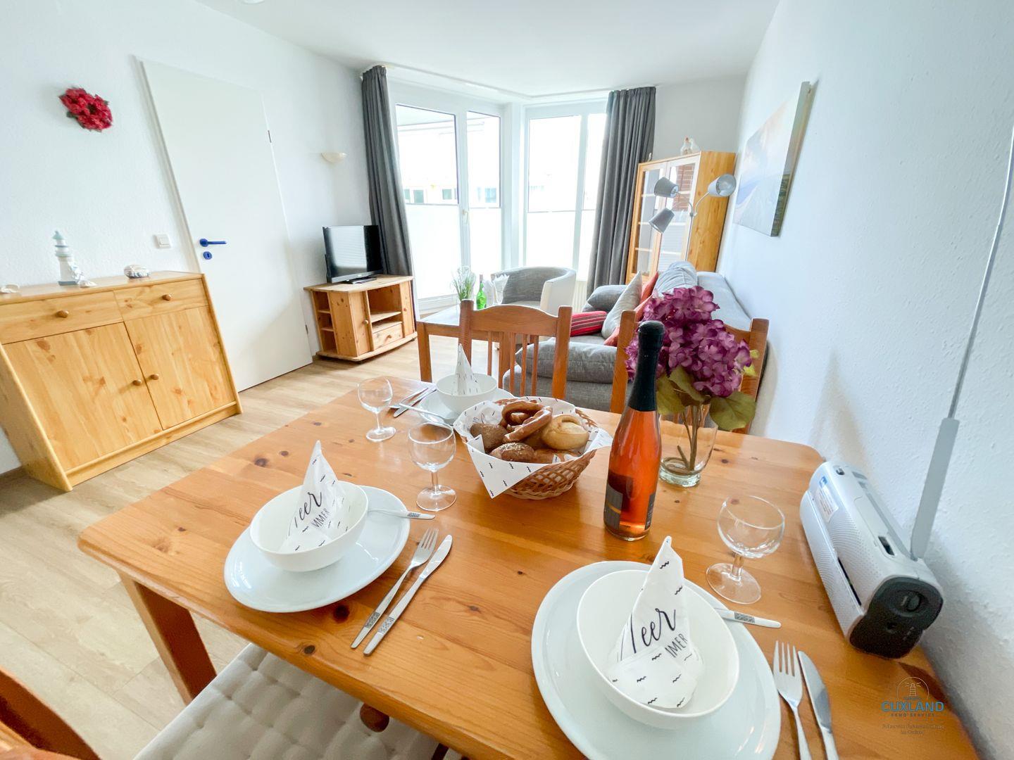 Wohnzimmer aus erreicht ihr auch den Balkon mit Teilseesicht. Das Bad ist