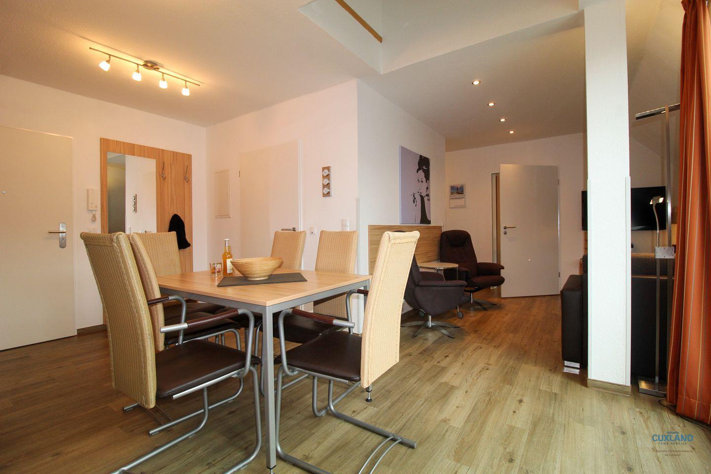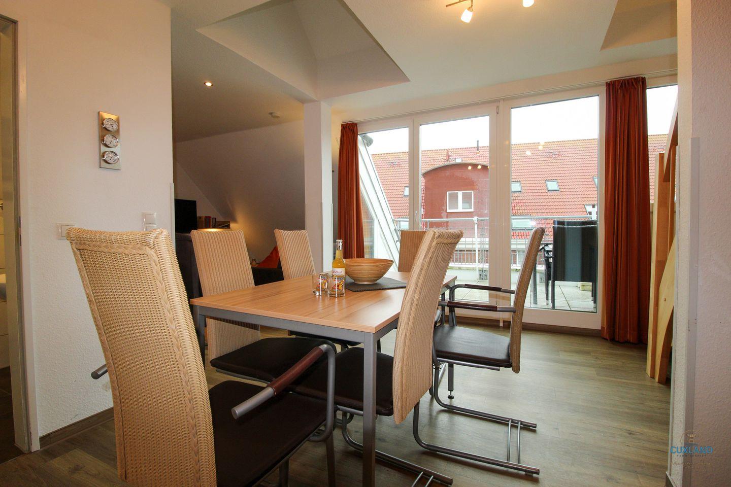 Hochwertige Ferienwohnung auf 2 Ebenen in bester Duhner Lage! Platz für bis zu 6 Personen. Barrierefreie untere Ebene mit Schlafcouch im Wohnzimmer, Schlafzimmer mit Doppelbett und großzügigem Essbereich. Obere Ebene mit weiterem Schlafraum und Bad. Kostenloses WLAN, reservierter Parkplatz und Strandkorb inklusive.