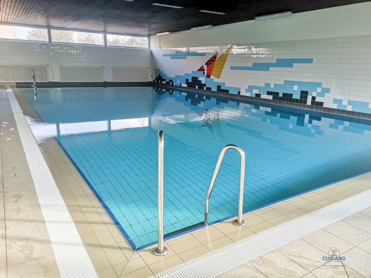 ist das große mit Tageslicht durchflutete Schwimmbad und die Sauna (gegen