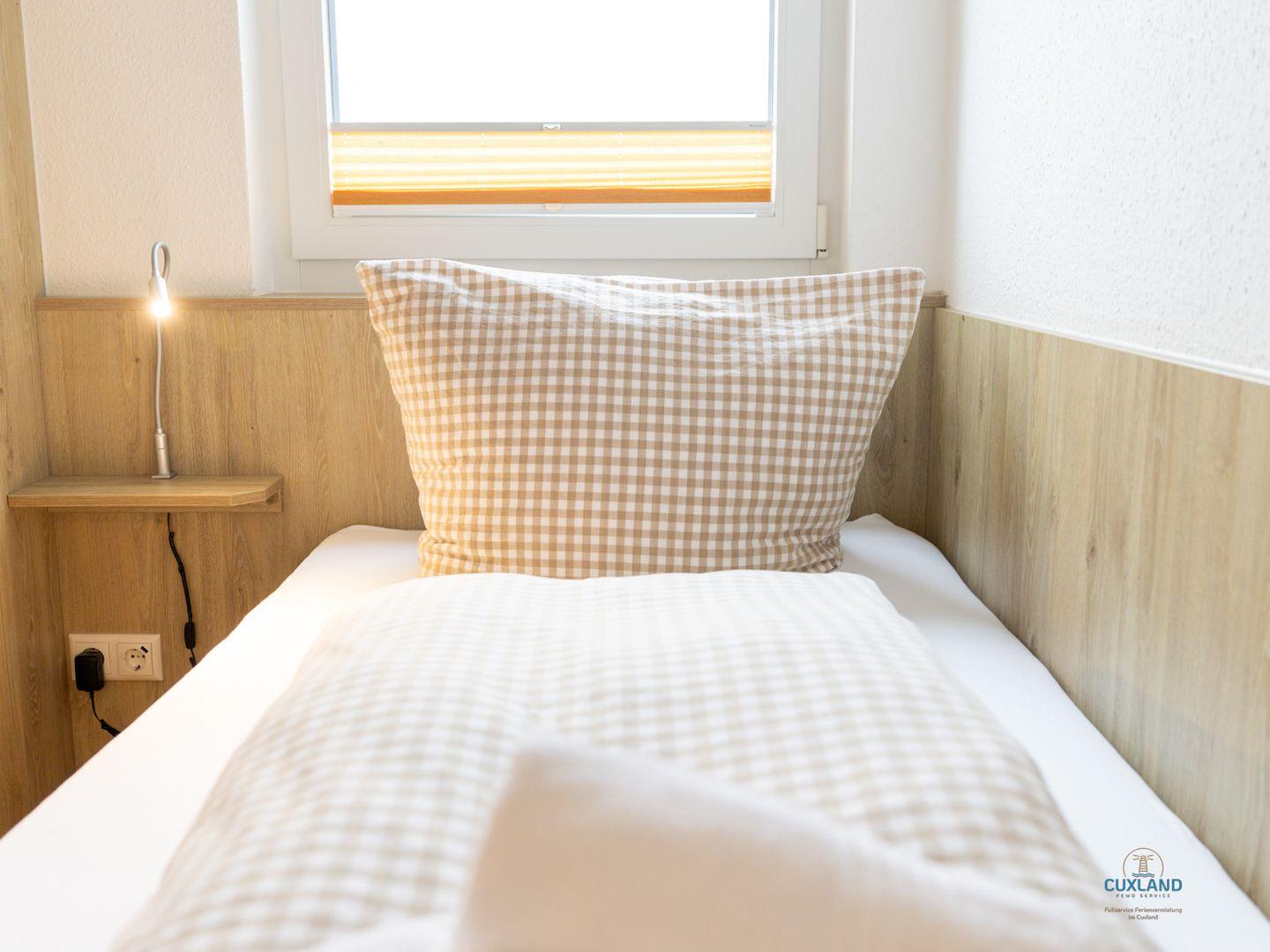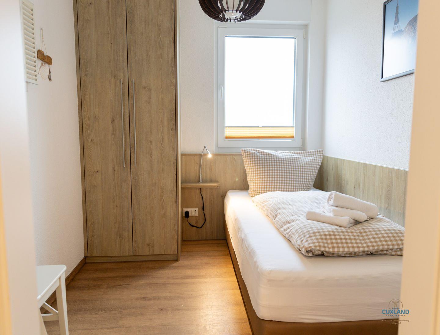 euch ein stylisch eingerichtetes Schlafzimmer mit Einzelbett, sowie ein zweites
