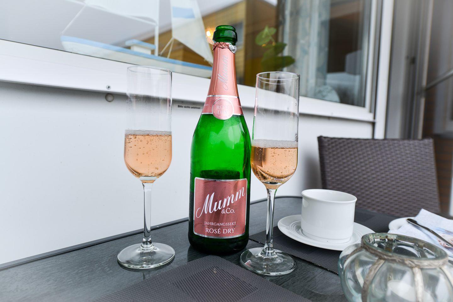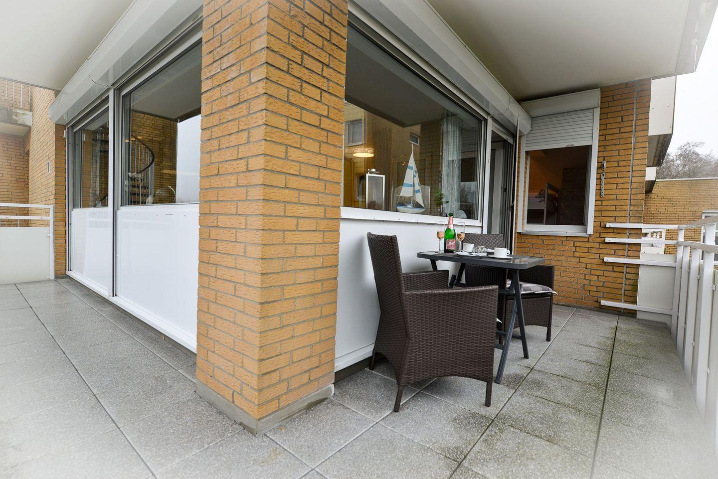 Moderne Ferienwohnung in Cuxhaven mit großem Eckbalkon und Zugang zu Schwimmbad und Sauna.