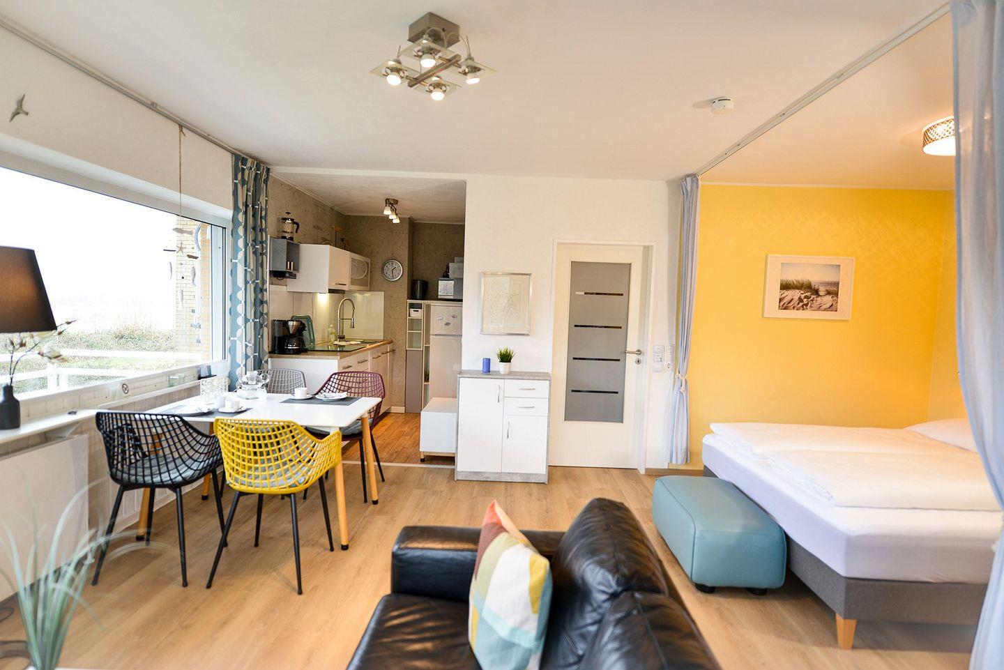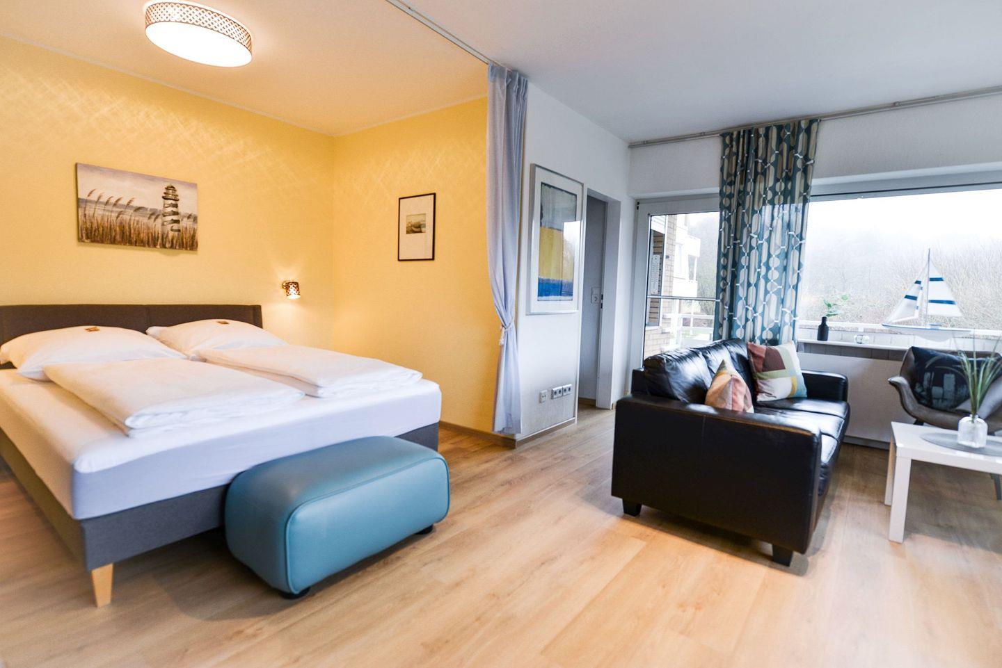Diese stilvolle Ferienwohnung erstreckt sich über ca. 42m² und ist modern eingerichtet. Sie bietet Platz für bis zu 4 Personen und besticht durch eine umlaufende Fensterfront, die den Raum einladend und lichtdurchflutet erscheinen lässt.