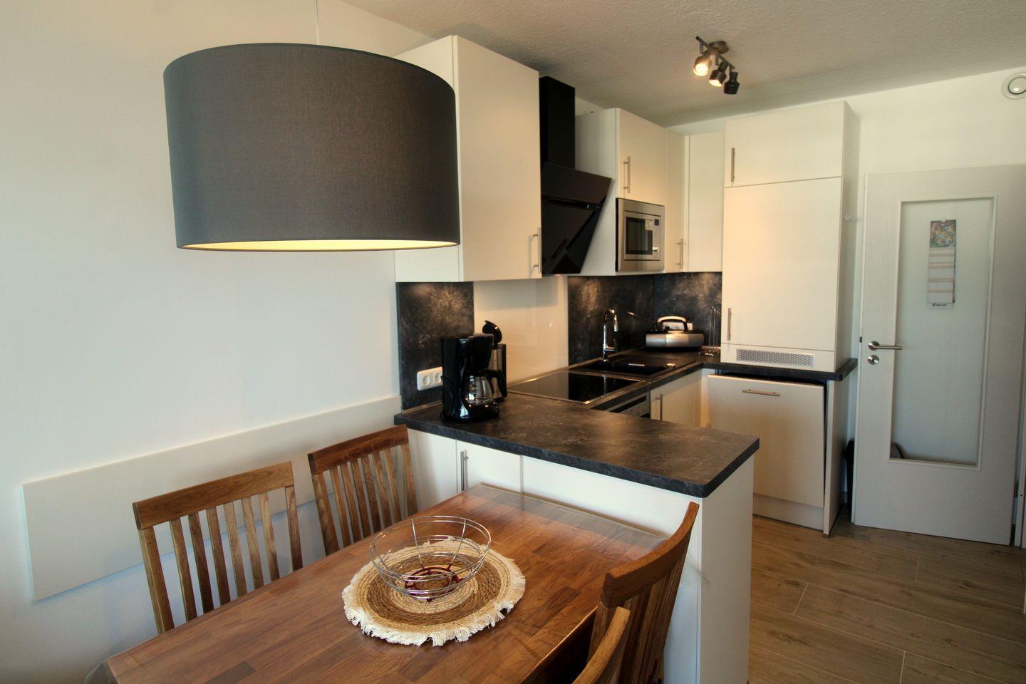 Die Küchenzeile ist mit allen notwendigen Geräten ausgestattet wie Ceranfeld, E-Herd, Mikrowelle und Geschirrspüler.