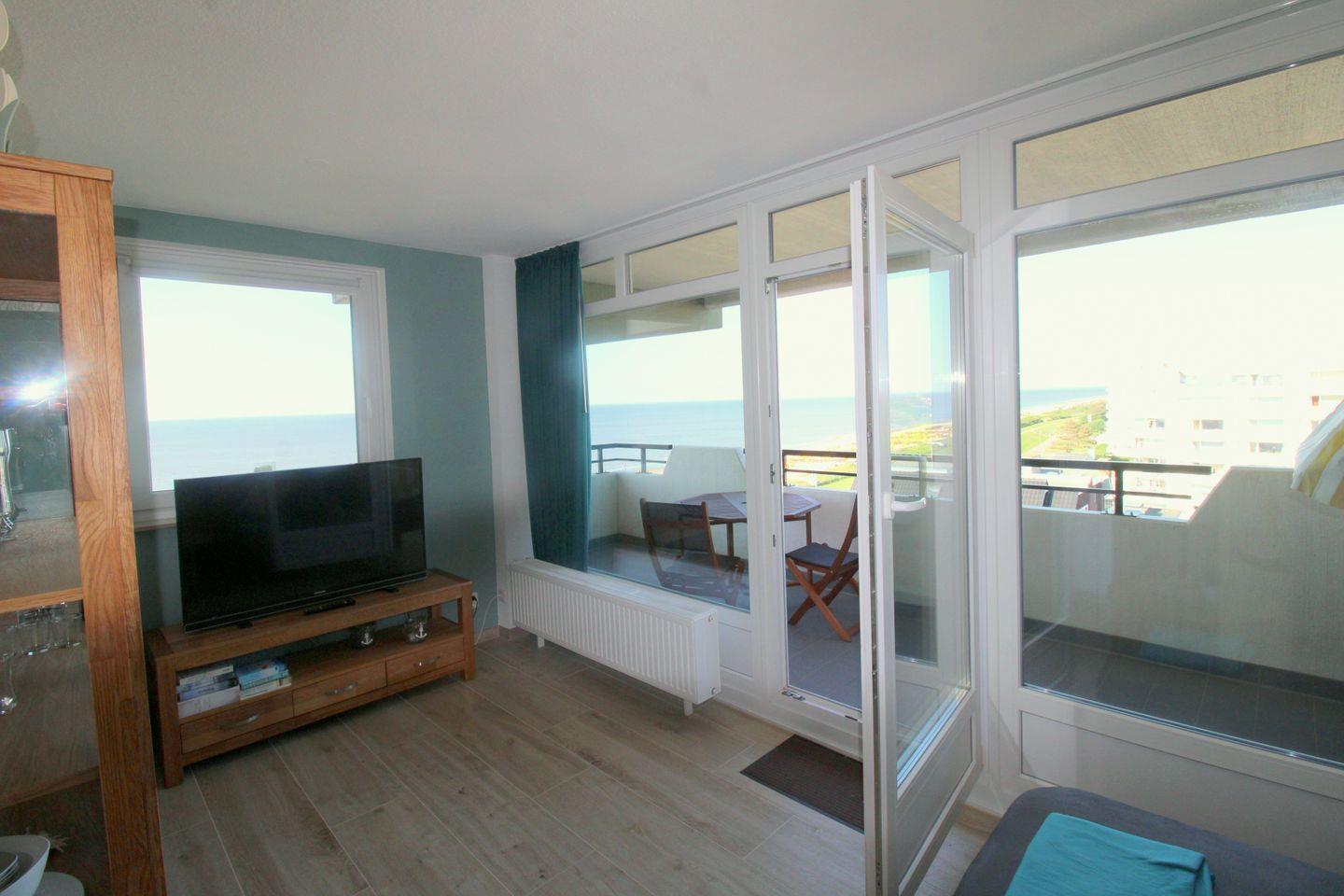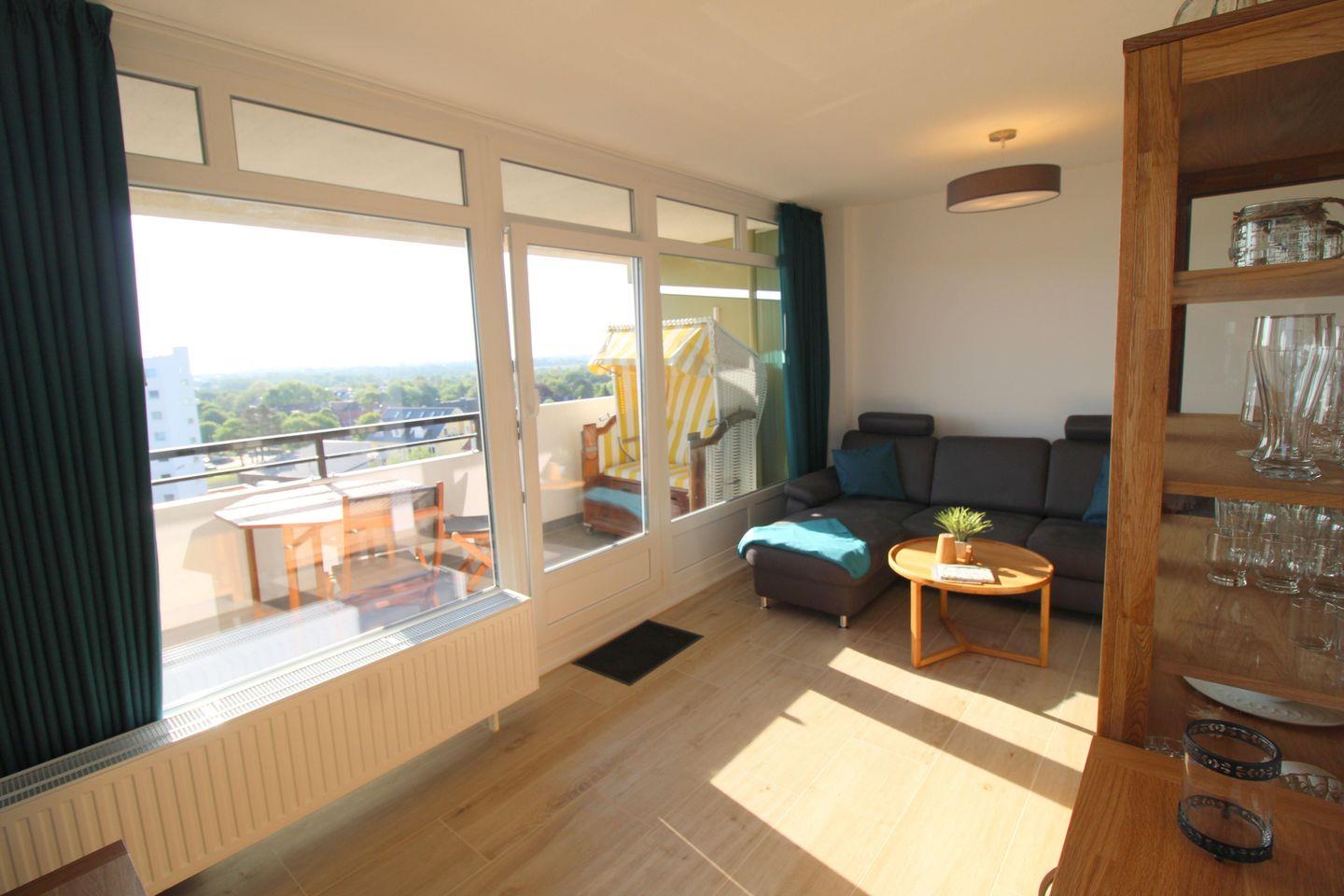 Die modern und hochwertig eingerichtete Ferienwohnung Nr. 101 (ca. 44 m²) wurde Anfang 2024 kernsaniert und befindet sich im 7. Obergeschoss. Von hier genießen Sie einen hervorragenden Seeblick über die Elbmündung bis nach Schleswig-Holstein – ein besonderes Highlight, das Sie sogar vom Sofa aus durch das seitliche Fenster erleben können.