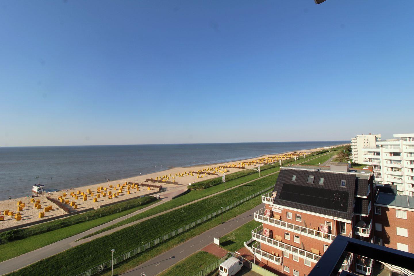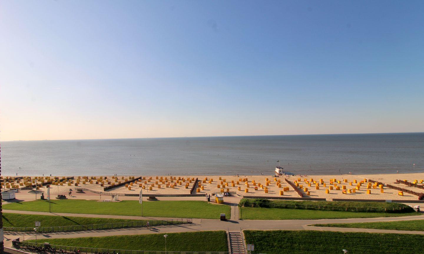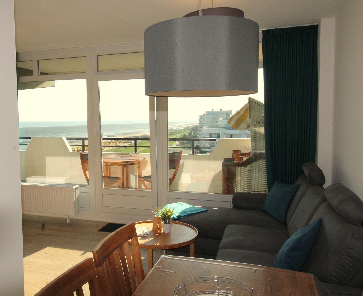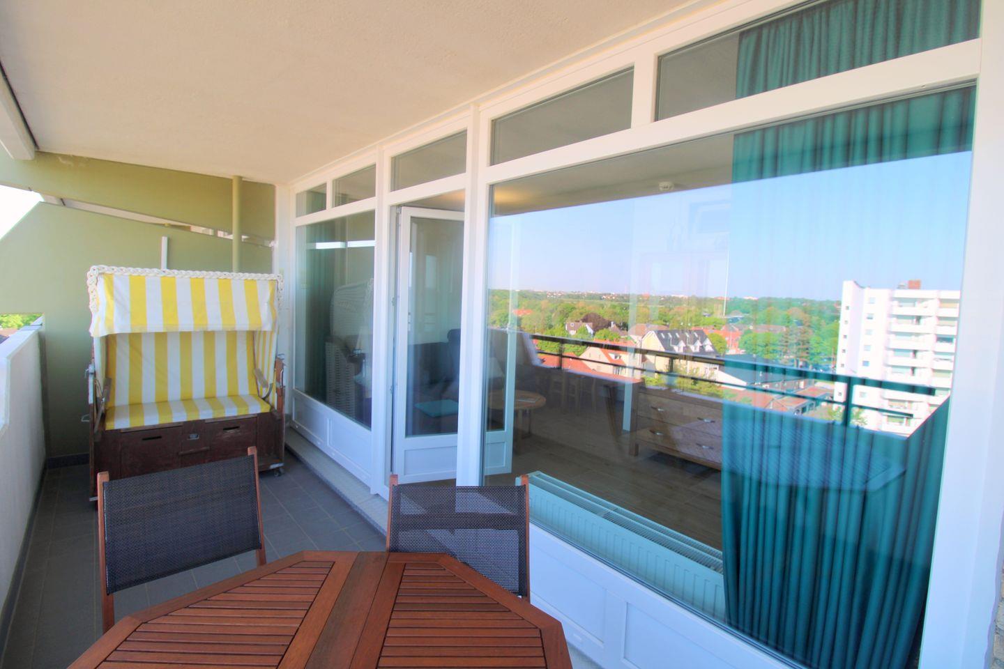 Auf dem Balkon lädt ein gemütlicher Strandkorb dazu ein, die Nordsee, das lebhafte Treiben am Strand sowie vorbeiziehende Schiffe zu beobachten.