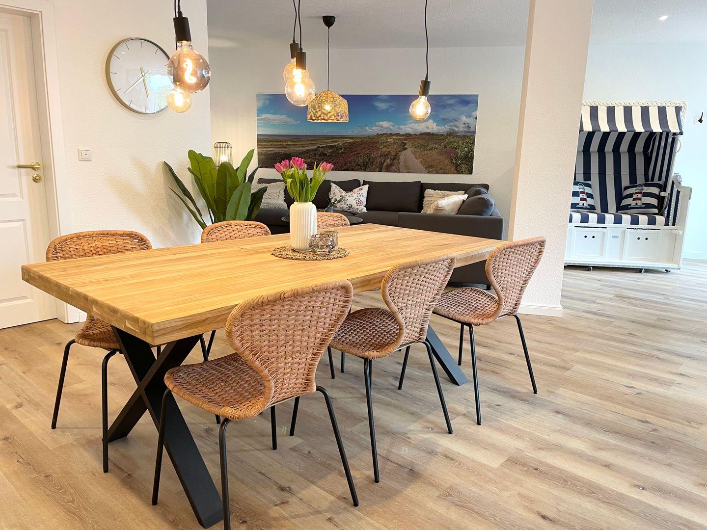 Die moderne Küche mit Kochinsel lädt zum gemeinsamen Kochen ein, während der große Esstisch genügend Platz für gemütliche Mahlzeiten bietet.