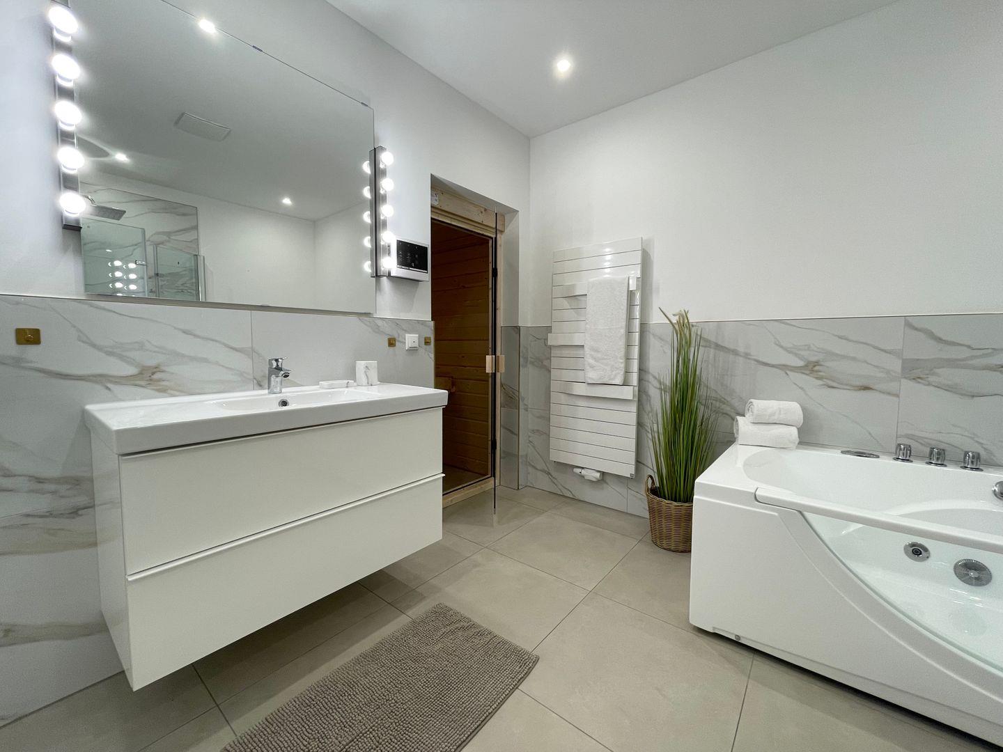 Zwei Badezimmer, eine Sauna und eine Whirlpool-Badewanne sorgen für Entspannung und Erholung.