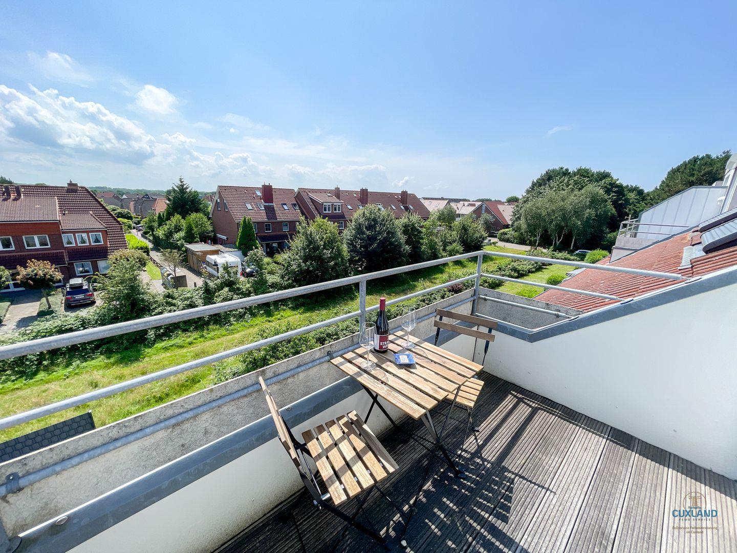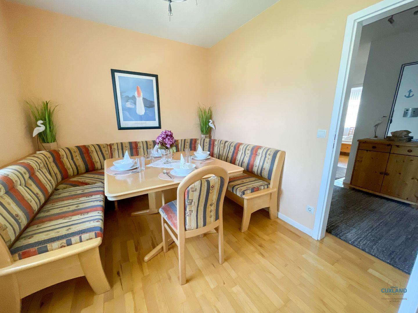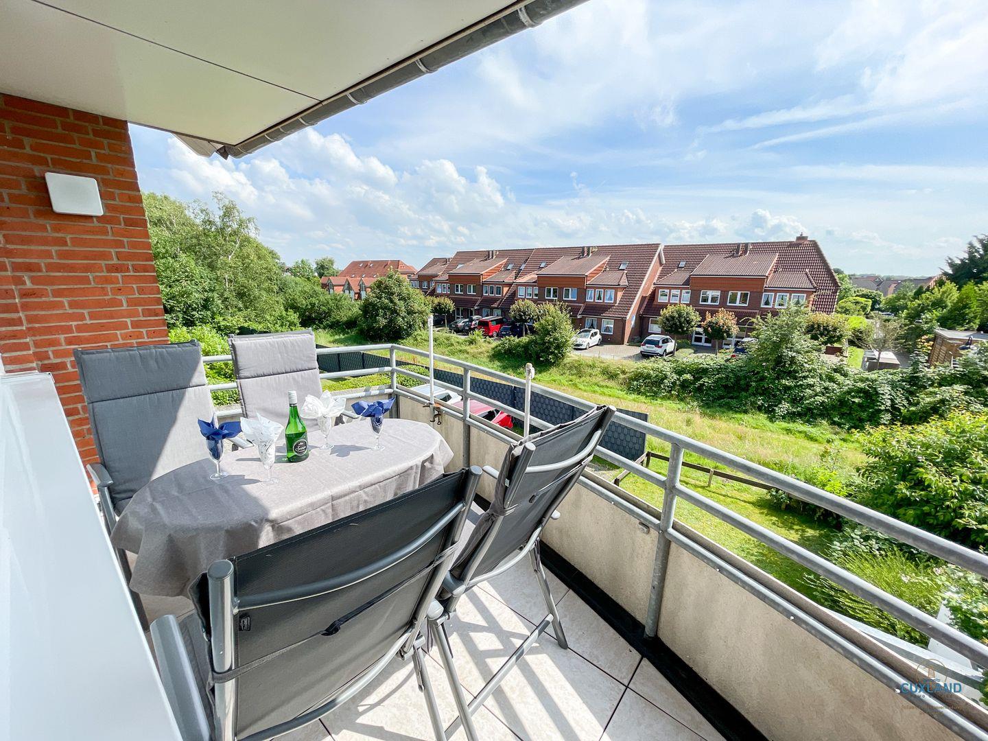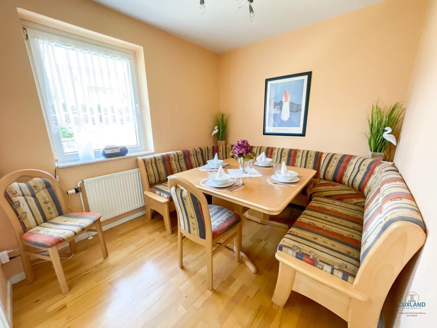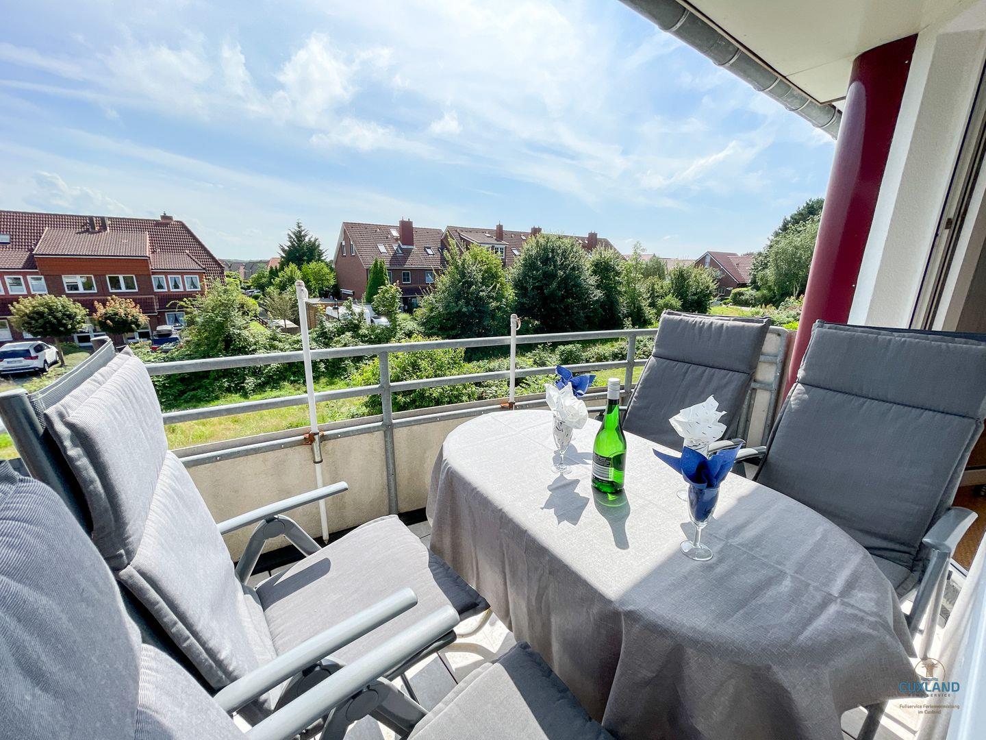Gemütliche Maisonette-Ferienwohnung in Cuxhaven mit zwei Balkonen, großem Essbereich und Tiefgaragenplatz für erholsamen Familienurlaub.