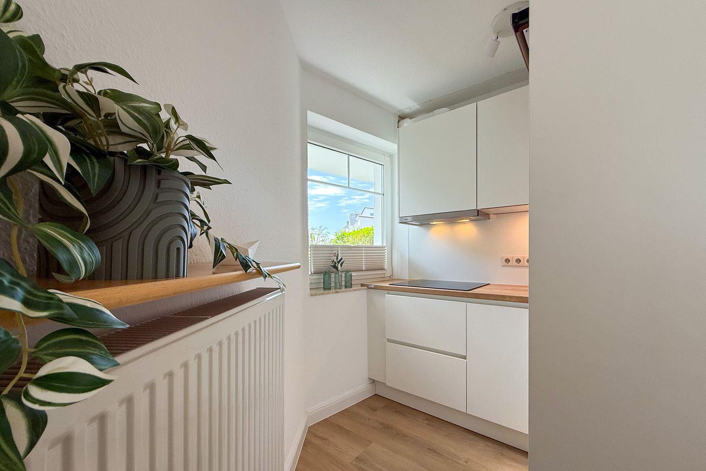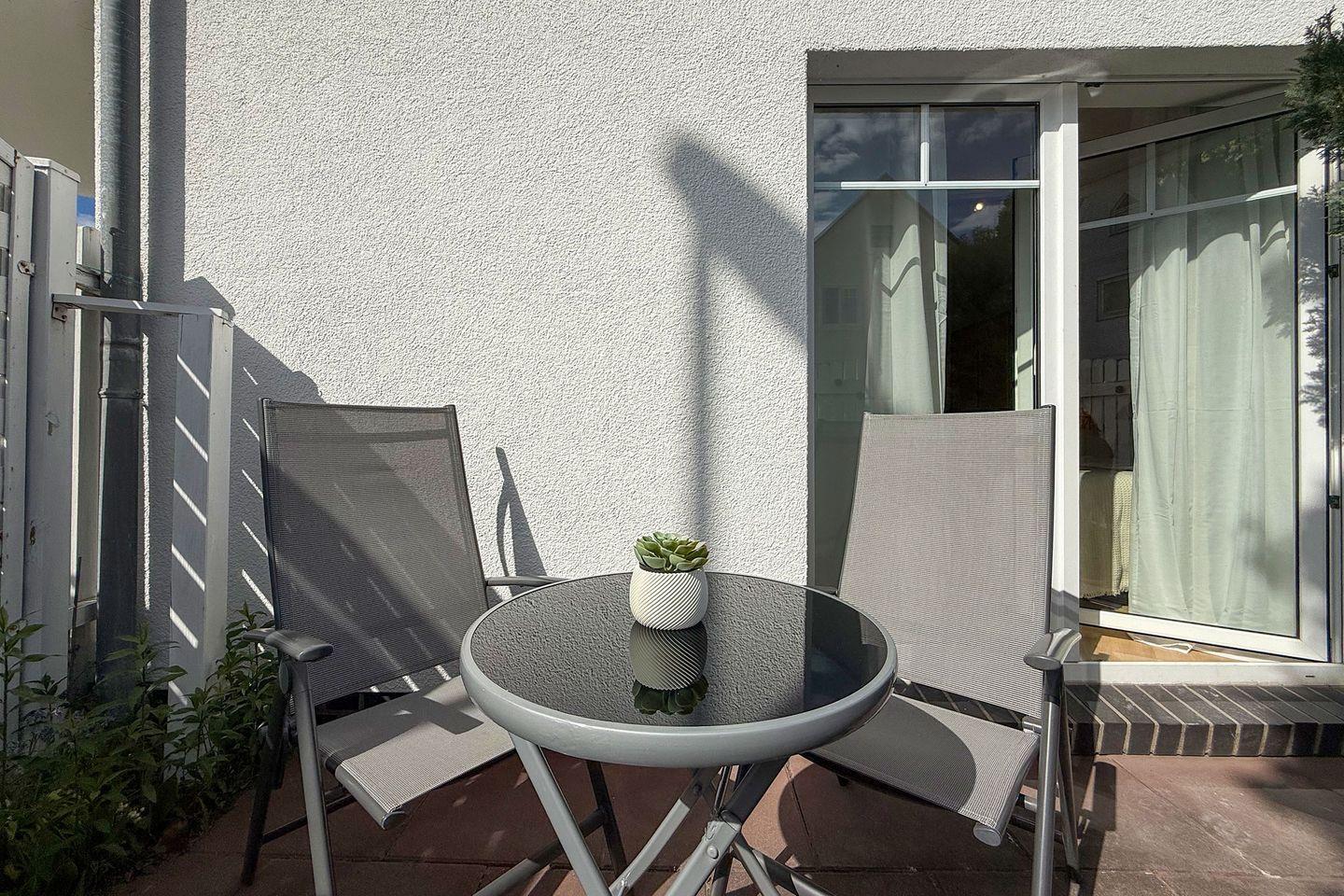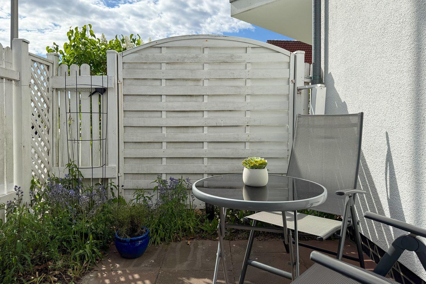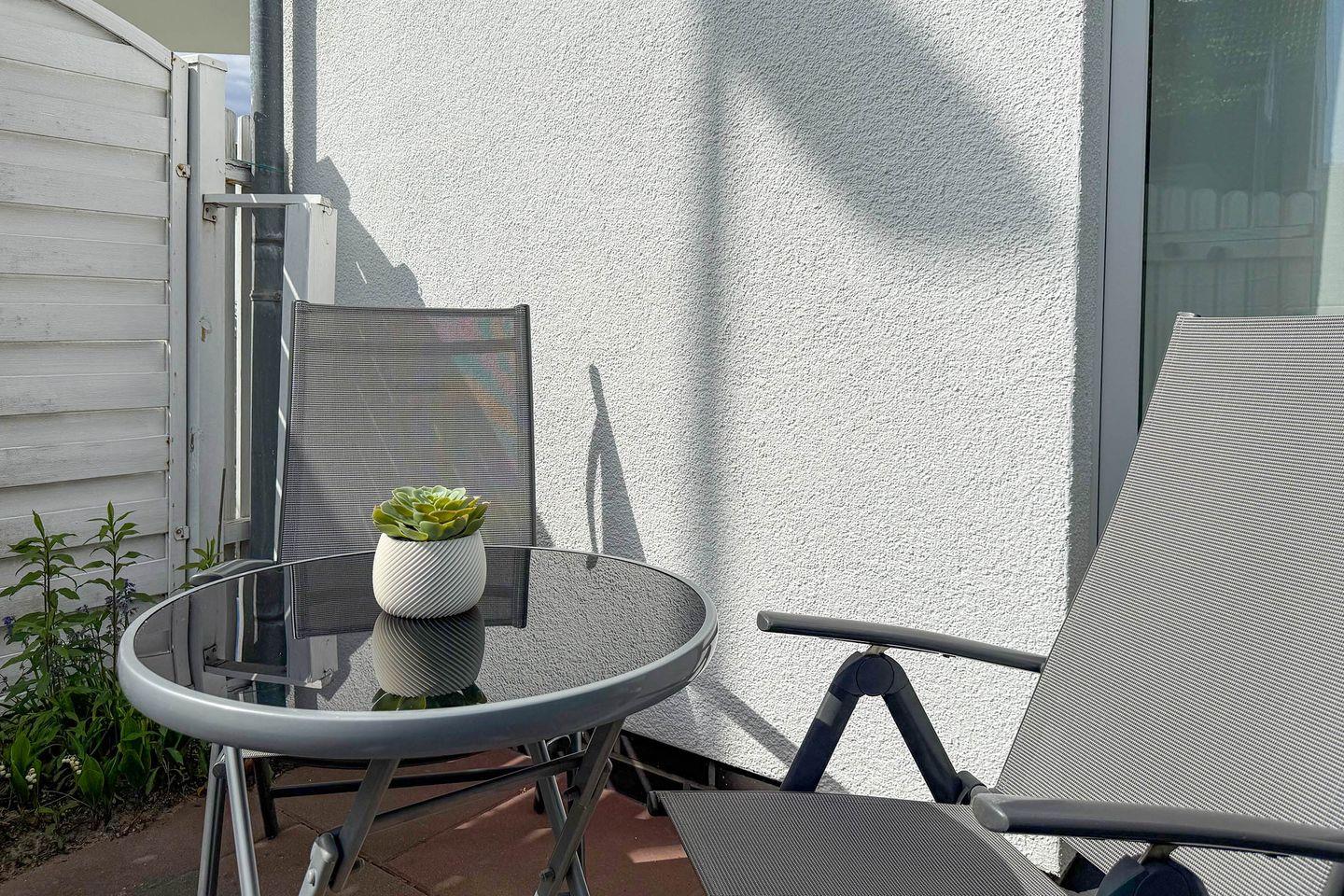Ein besonderes Highlight dieser Ferienwohnung 2 "Strandzeit" ist die geschlossene Terrasse, auf der Sie bei schönem Wetter entspannen und die Sonne genießen können. Gartenmöbel und ein Sonnenschirm sind ebenfalls vorhanden, um Ihren Aufenthalt noch angenehmer zu gestalten. Ein Sichtschutz sorgt für die nötige Privatsphäre, während Sie die Zeit im Freien in vollen Zügen genießen können.