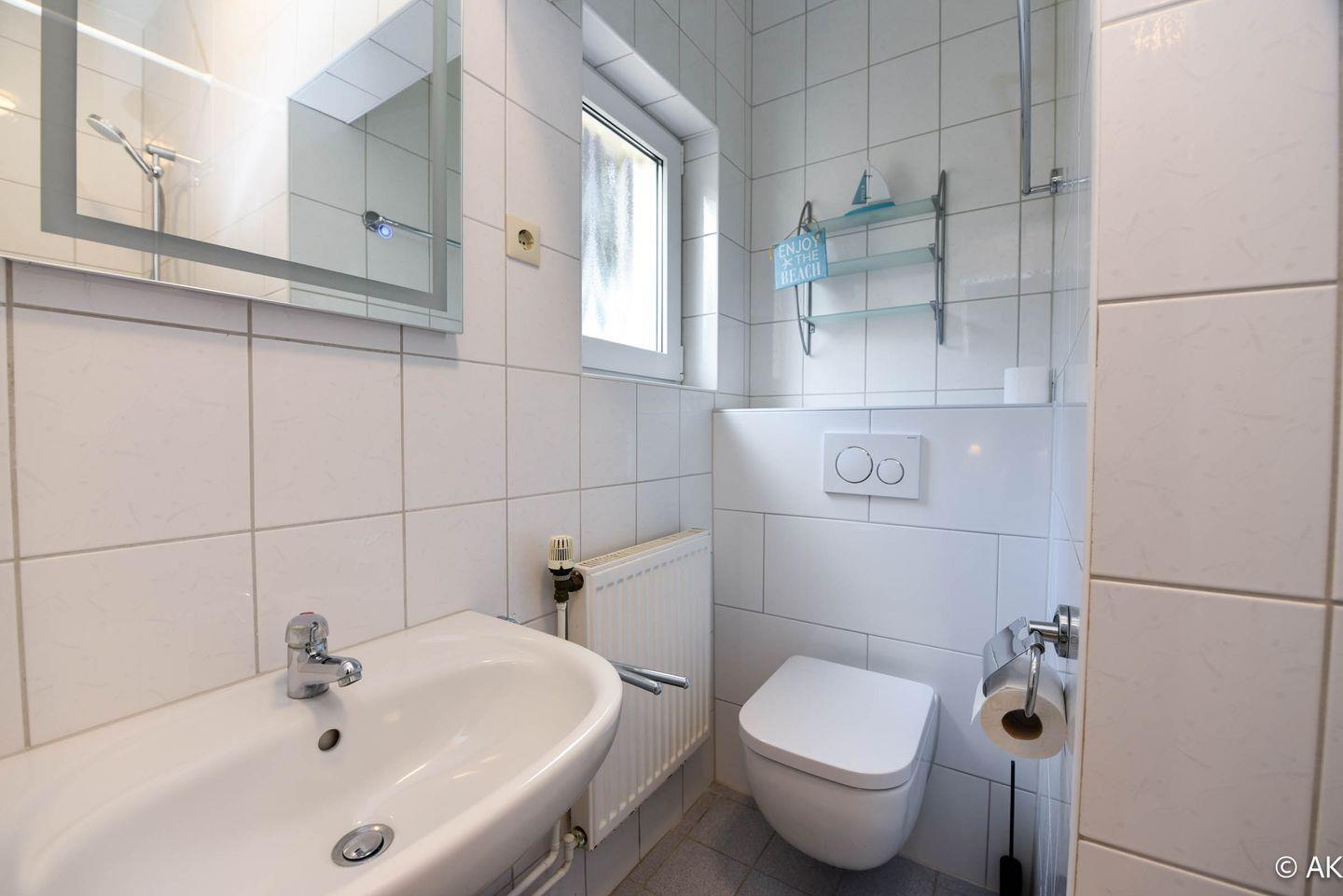 Das zweite Badezimmer, das vom Flur abgeht, ist ebenfalls mit einer Dusche und einem WC ausgestattet, was besonders bei der Nutzung durch mehrere Personen für zusätzlichen Komfort sorgt.