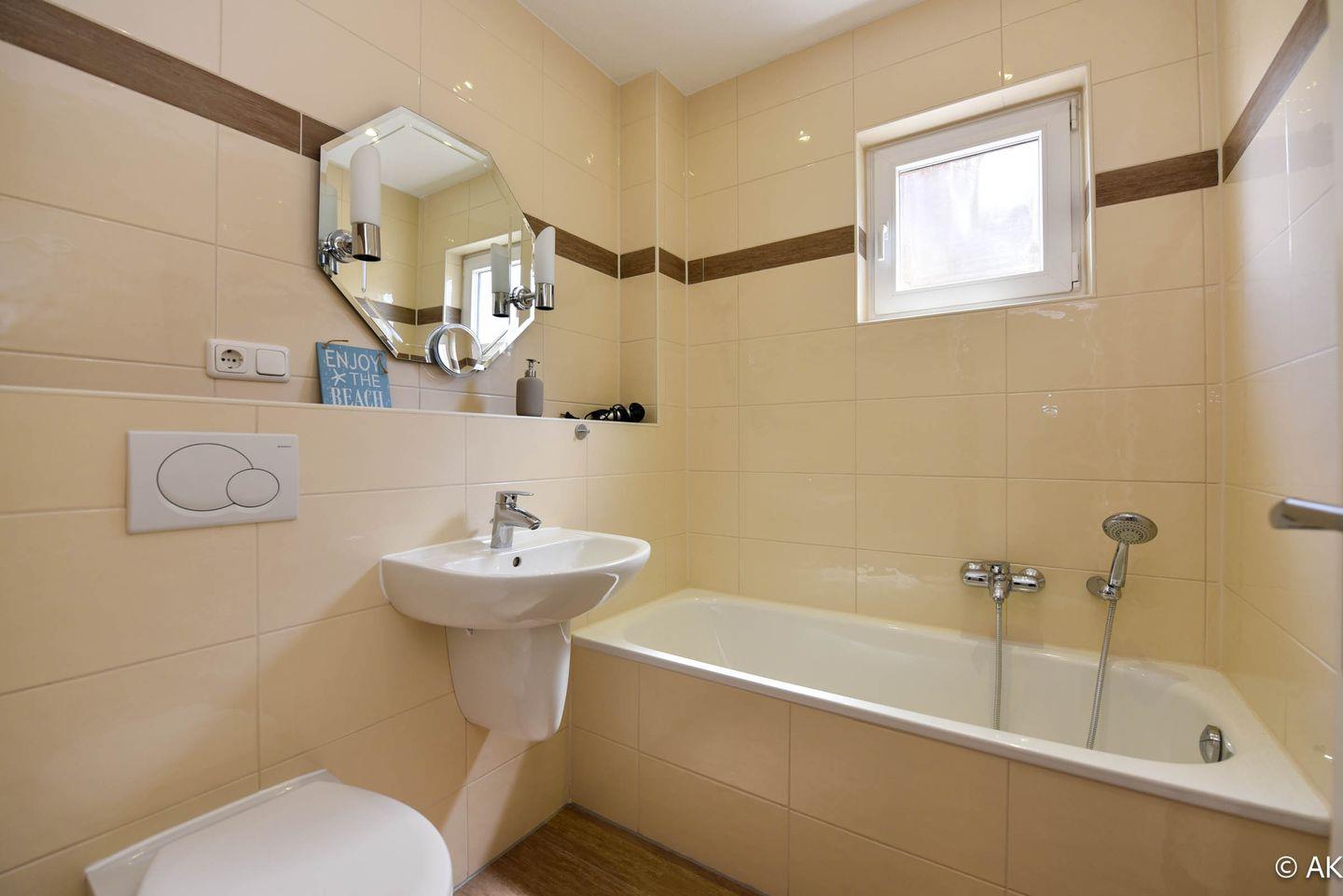 Das zweite Badezimmer, das vom Flur abgeht, bietet zusätzlichen Komfort und ist mit einer Badewanne sowie einem WC ausgestattet – perfekt für ein entspannendes Bad nach einem langen Tag am Strand.
