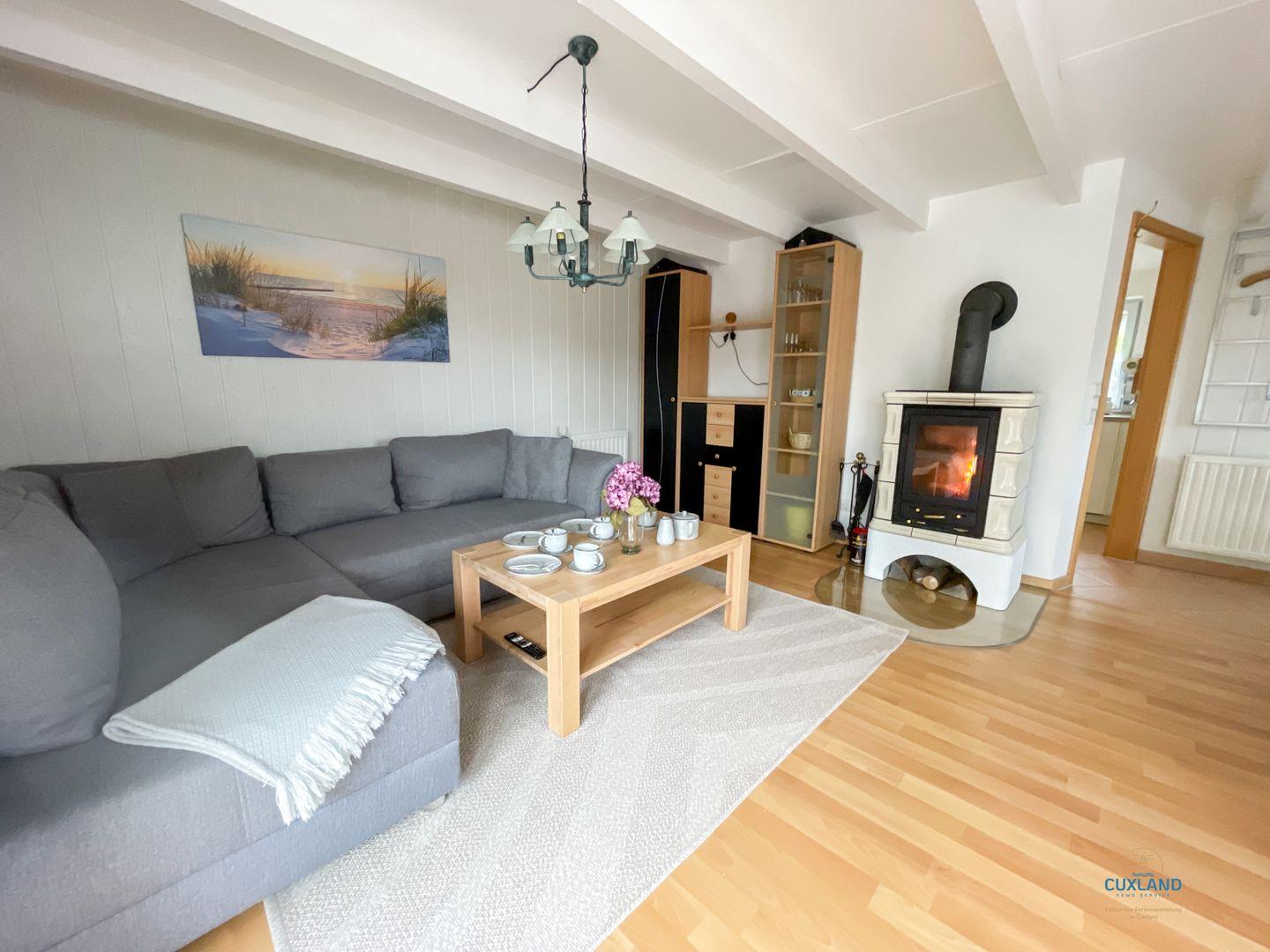 Im Mittelpunkt des Wohnbereichs steht der einladende Wohnzimmerbereich, der mit einem offenen Kamin für romantische Abende sorgt. Hier kannst du es dir auf der bequemen Sofaecke gemütlich machen. Die voll ausgestattete, abgeschlossene Küche bietet alle Annehmlichkeiten, die du für die Zubereitung deiner Lieblingsgerichte benötigst, darunter ein Herd, Backofen, Mikrowelle, Geschirrspüler und Kühlschrank.