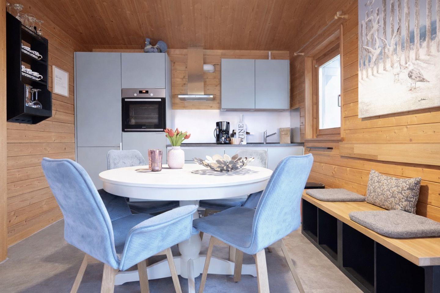 Im Inneren erwartet dich ein großzügiger Wohnbereich mit einer hochwertigen, gemütlichen Sofaecke und einem einladenden Essbereich. Hier kannst du entspannen, lesen oder den Abend nach einem langen Strandtag ausklingen lassen.