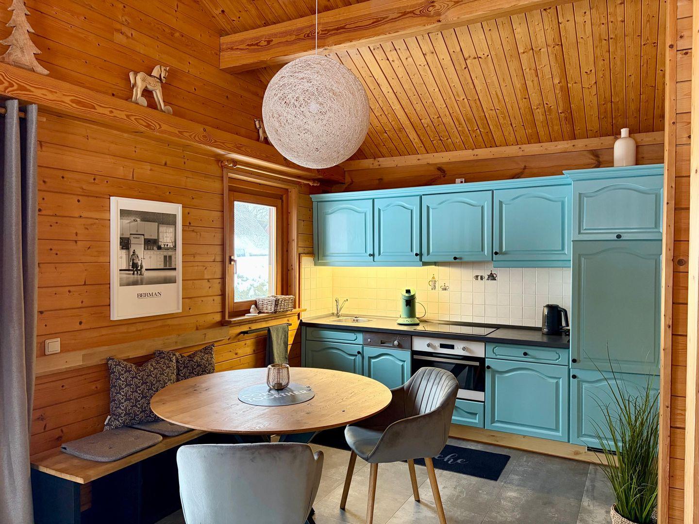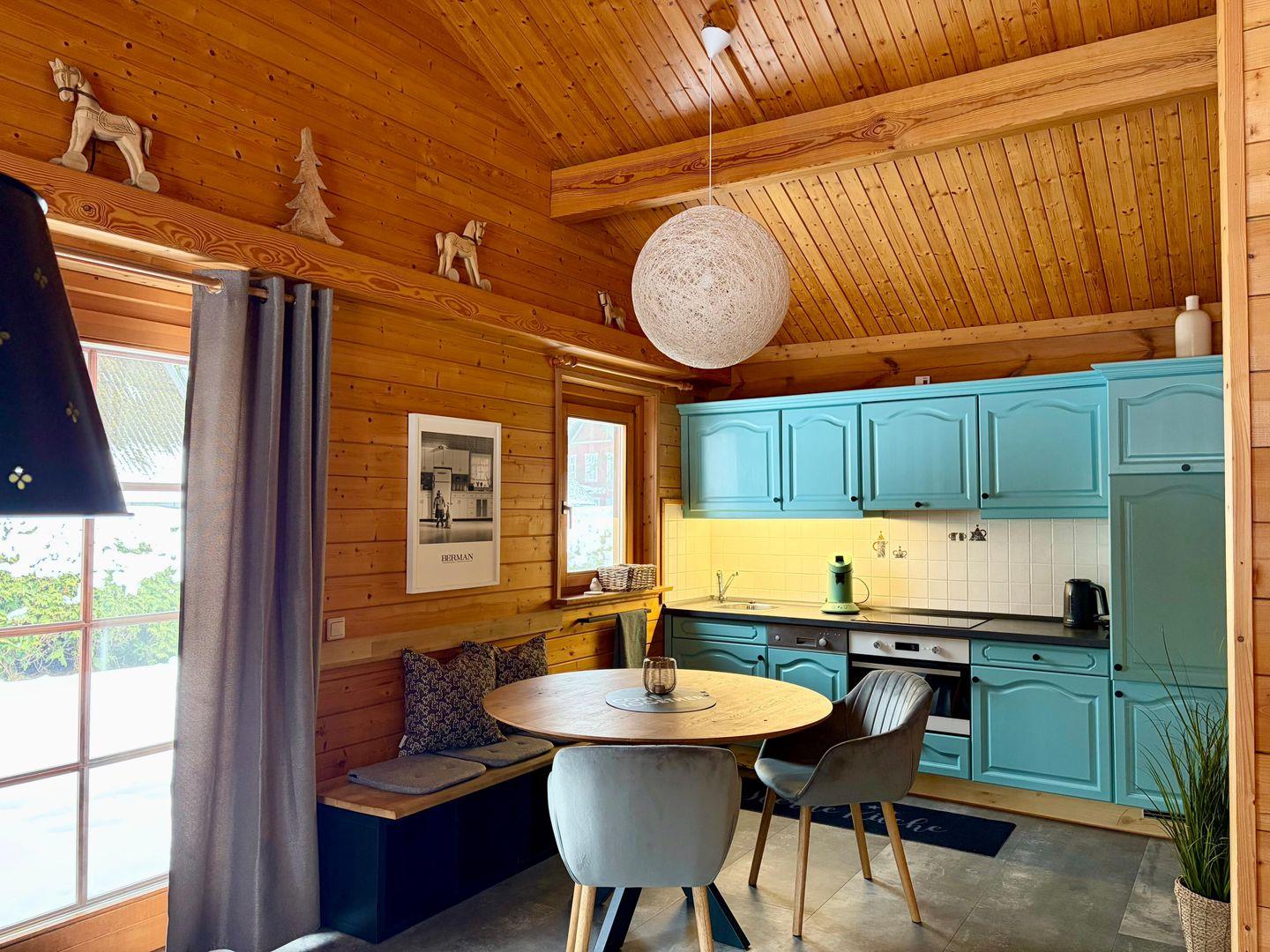 Das Ferienhaus ist liebevoll und modern eingerichtet und bietet dir den perfekten Komfort für deine Auszeit. Die großzügigen, ebenerdigen Räumlichkeiten bestehen aus einem großen Wohnbereich mit gemütlicher, hochwertiger Couchgarnitur und Essbereich mit Küche, ideal für entspannte Stunden. Die komplett ausgestattete, neu aufgefrischte Küche lässt keine Wünsche offen und sorgt dafür, dass du dich wie zu Hause fühlst.