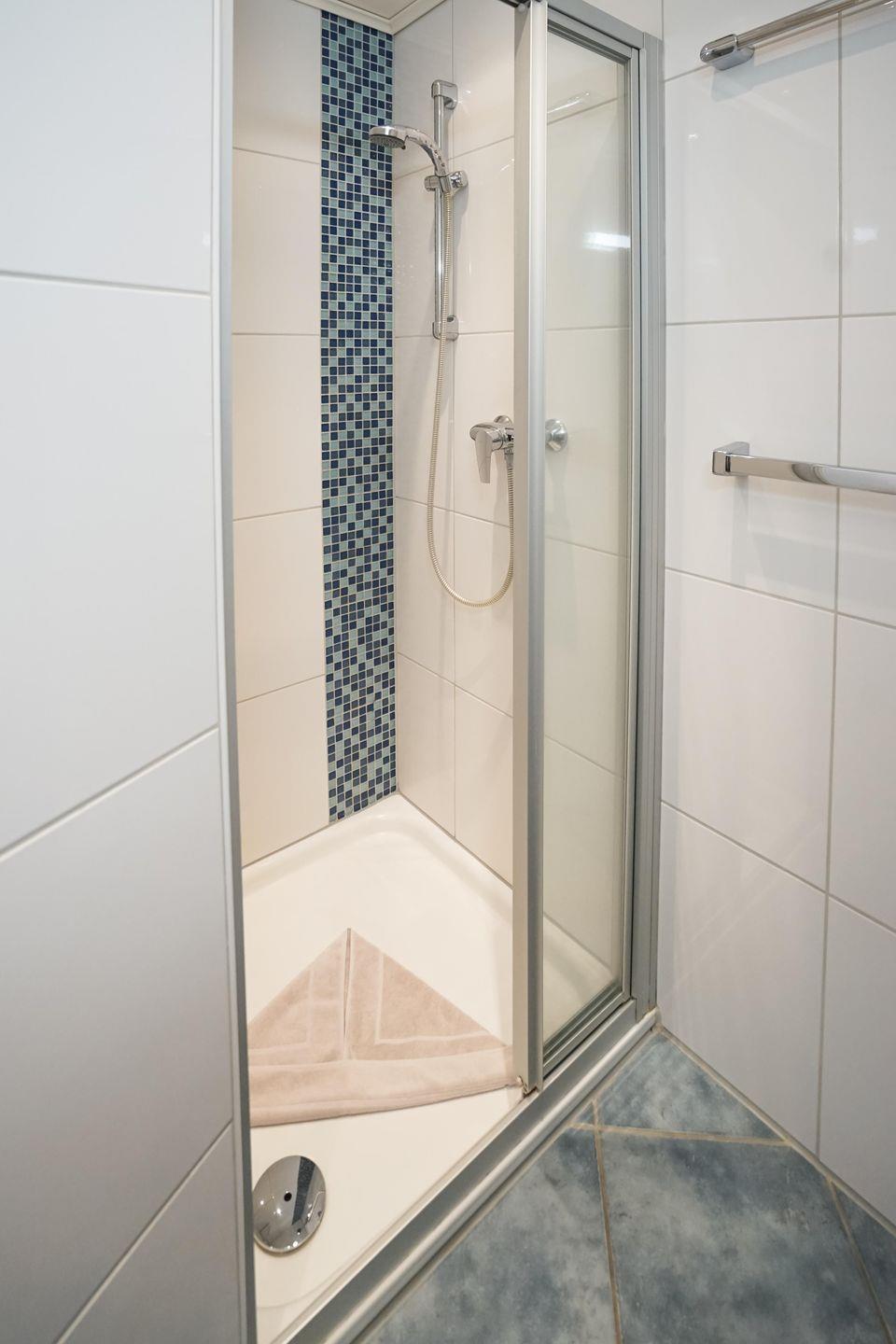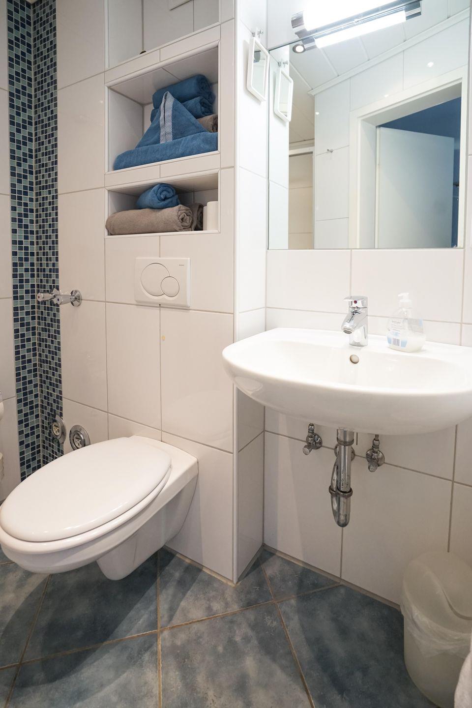 Bad mit Dusche. Flur mit Garderobe und Spiegel.
