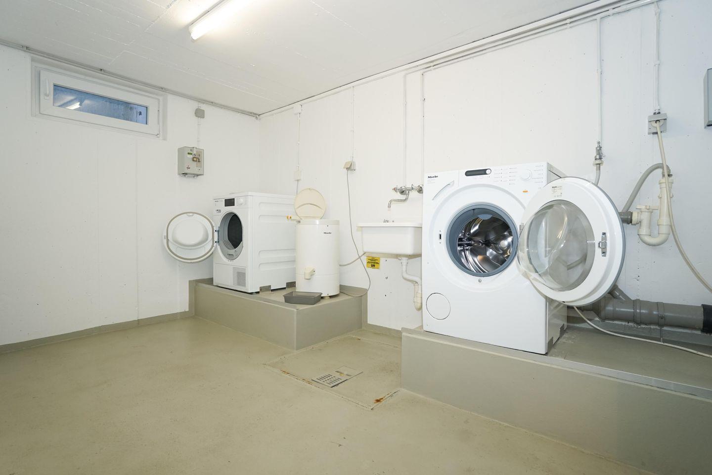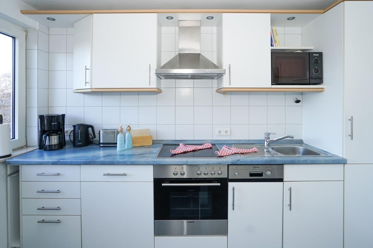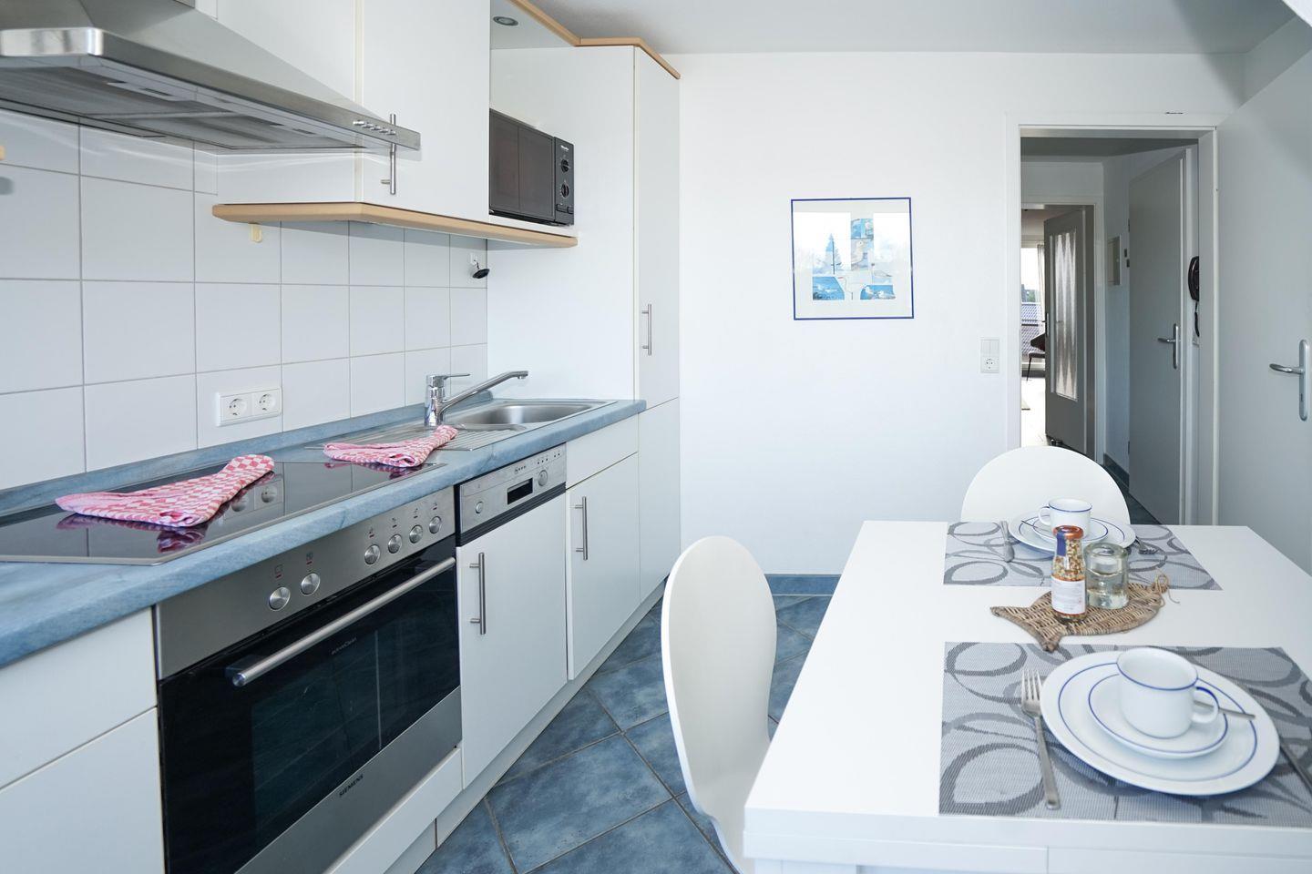 In der voll ausgestatteten Küche mit Spülmaschine findest du einen Esstisch mit Stühlen.