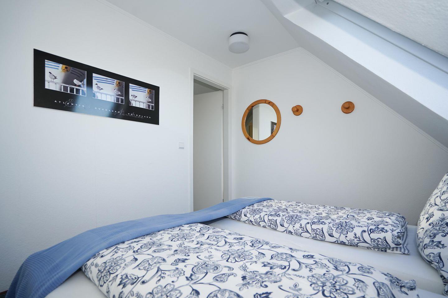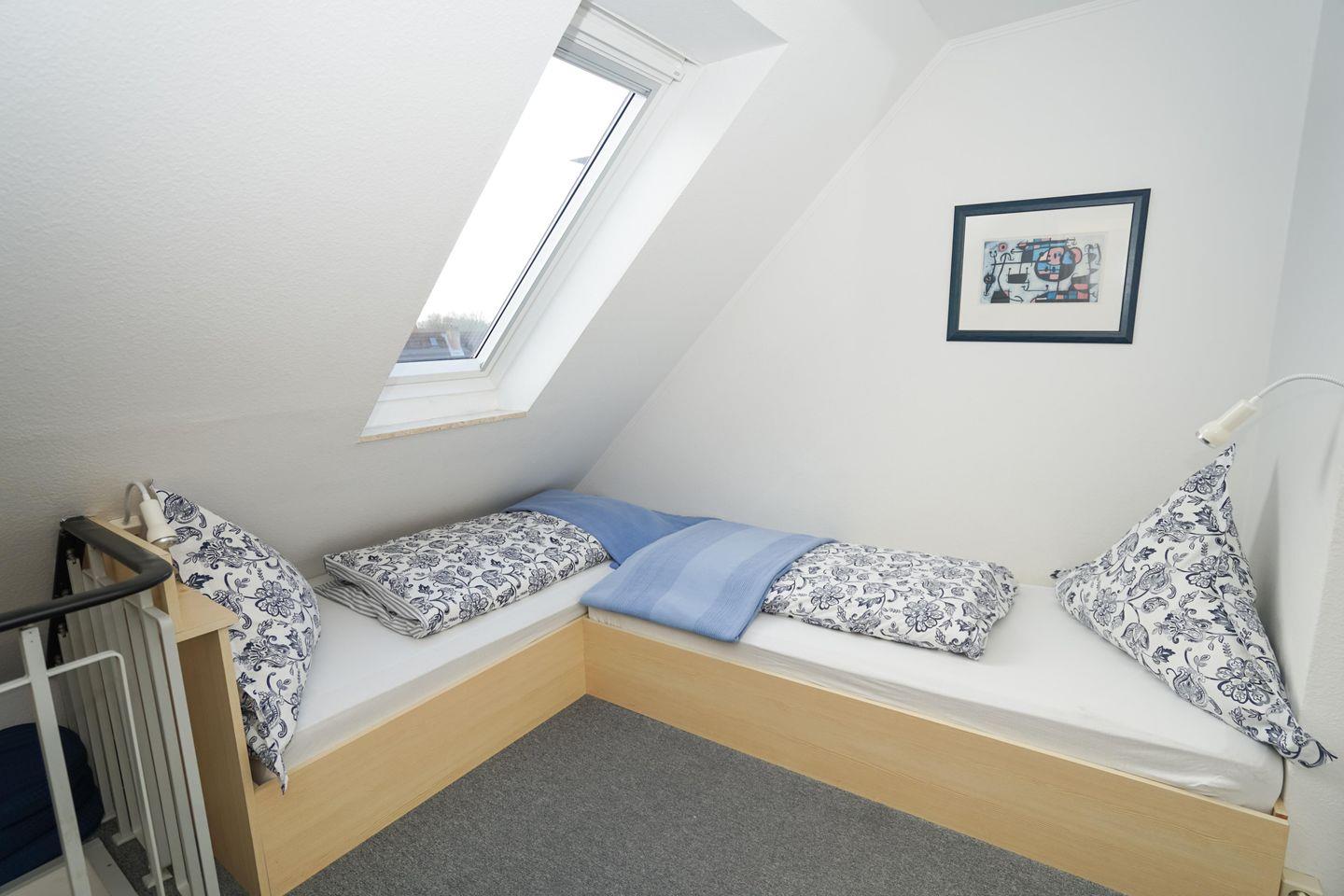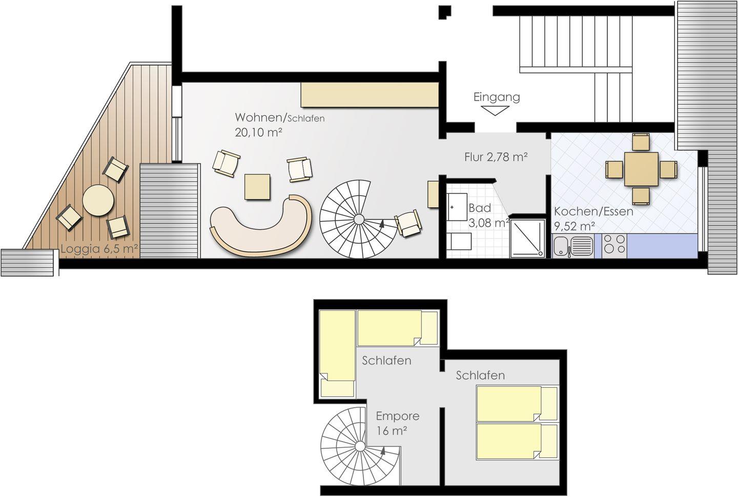 Über eine Wendeltreppe sind die gemütlichen Schlafplätze zu erreichen. Dort findest du ein extra Schlafzimmer und im Wendeltreppenraum zwei Betten. Das eine Bett ist kürzer als Standard-Maß, für Kinder bzw. kleine Personen gut geeignet.