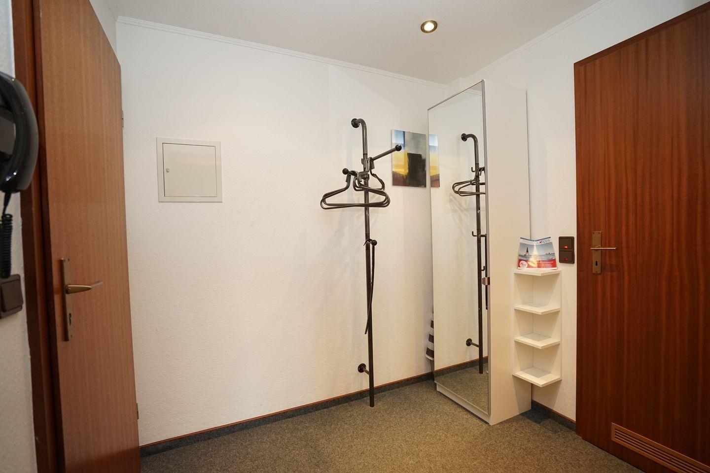 Bad mit Dusche. Flur mit Garderobe und Spiegel.