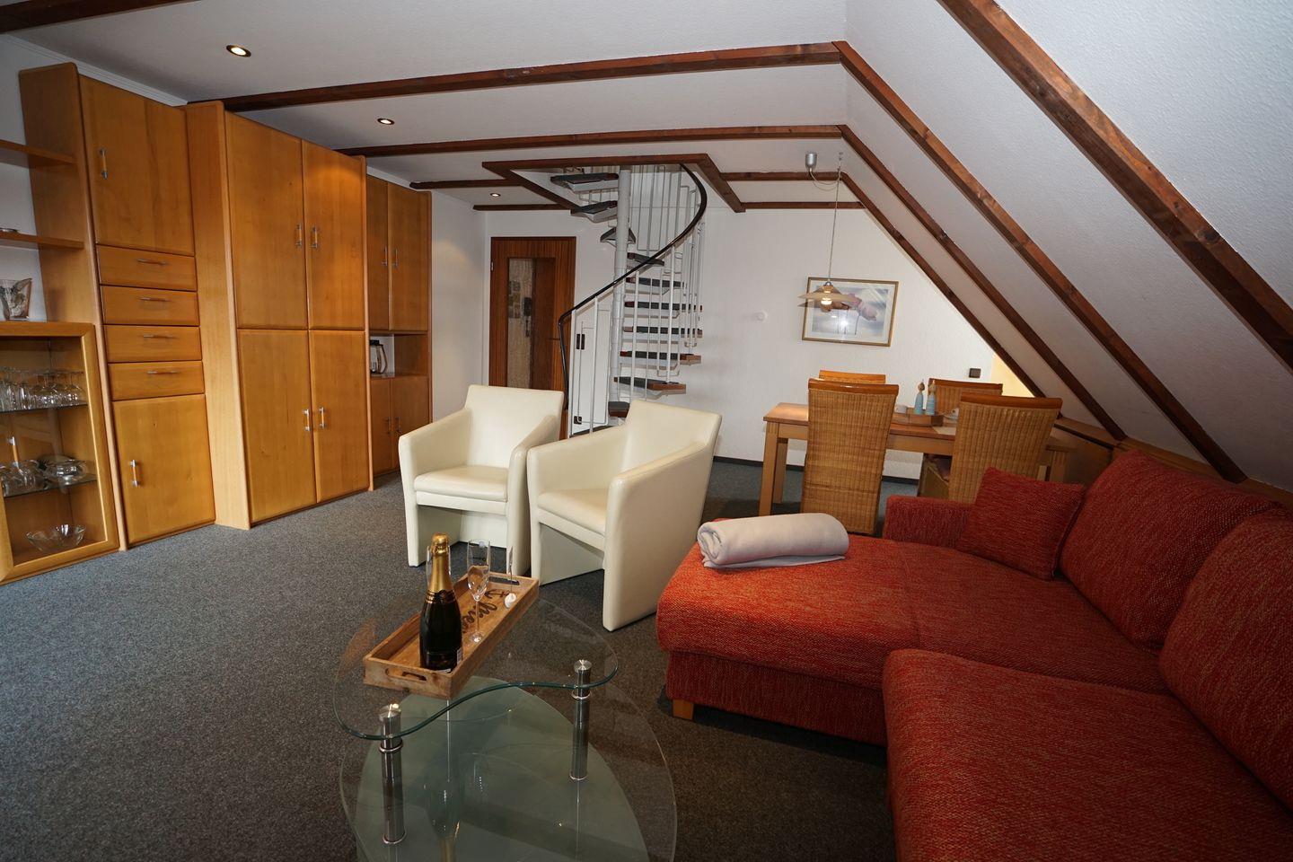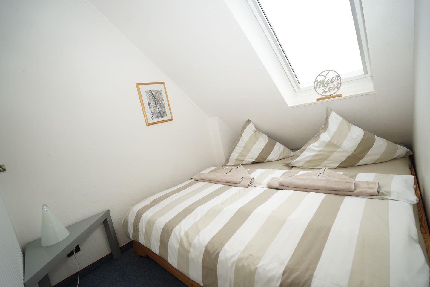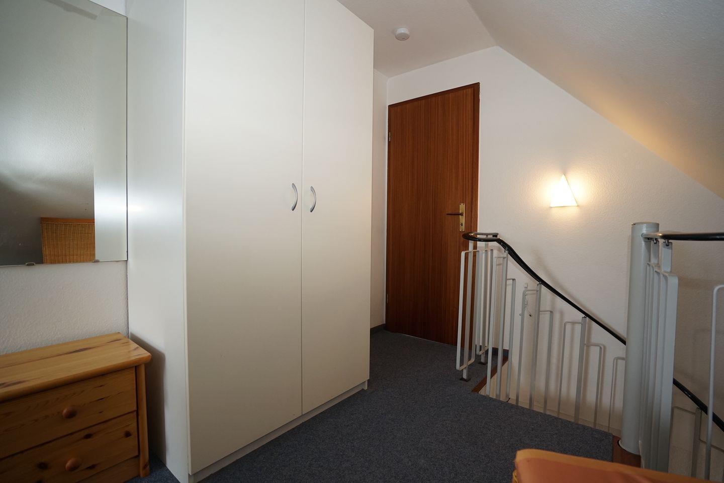 Über eine Wendeltreppe sind die gemütlichen Schlafplätze zu erreichen. Im Wendeltreppenraum befindet sich ein Doppelbett und Schrank, im zweiten kleinen Schlafzimmer ein weiteres Doppelbett. Hier können Sie es sich gemütlich machen!