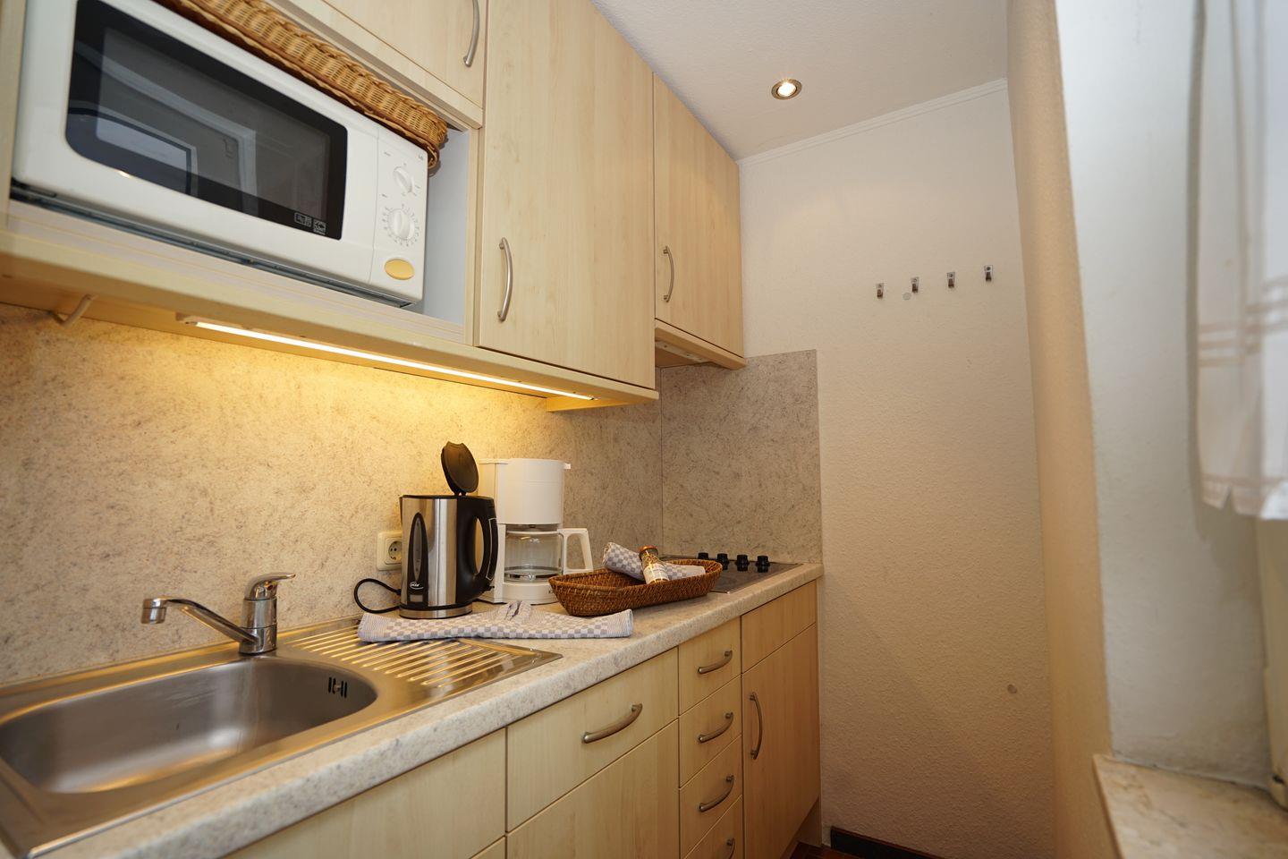 Küchenzeile mit Spülmaschine und Mikrowelle, offen zum Wohnzimmer.